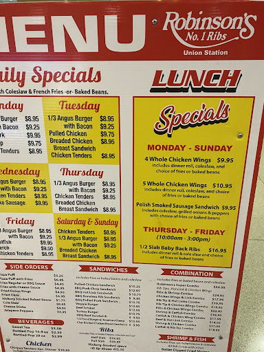 Read moreBeen to Chicago Union Station many times over the last several years but I had yet to visit Robinsons #1 Ribs until this weekend. I must say I was impressed. I come from a BBQ meat smoking family so I know good wood smoked meat when I taste it. Usually food court places are a toned down version of the larger places and the food is expedited because the staffing is minimal. I was skeptical because I couldn't smell the BBQ aroma in the air as I stepped to the ordering counter. I decided to take a gamble and order the Deluxe combo platter. $28.00. Wings, ribs, baked beans, roll and a smoked sausage. The meal was Doing-The-Darn Thang you hear me!!!!! The ribs were tender and had the backyard lighter fluid taste!! The chicken was fried right and the baked beans were just that but tasty. And....And....And..the best way you can judge good BBQ is when you eat it does it leave that BBQ smoked smell on your fingers . Real smoked meat will, even after washing your hands. Robinsons is legit and I don't co-sign BBQ joints easy I can't wait to visit an actual restaurant one day and...