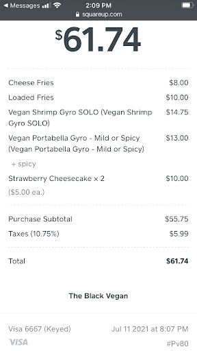 Read moreOn July 12 we visited The black vegan, food was great however the prices and the way the food was presented was terrible, no clear communication on how it was going to be served. My order was two separate wraps a order of cheese fries and a order of loaded fries(fries with many vegetables and sauce). How my mother placed the order over the phone was clear and how the owner took the order was clear. The owner who took the order even asked upon repeating the order back to my mom was the fries a separate order and my mom replied yes. The owner then charged my mom $8.00 for cheese fries and put them in the same tray as one of the wrap. She then charged us $11.00 for the loaded fries and put them in the other tray with the other wrap.Then these two little cheese cake in another huge styrofoam container. Therefore we were charged for an order of cheese fries and loaded fries but given a side of cheese fries and a side of loaded fries, but it was clear it was a separate order because it was for my little brother. When we arrived at the restaurant after waiting for over an hour for the food even though we called ahead and was presented with the food in the combined trays, the owner stated to me that she combined the food in the trays to save on the use of styrofoam. I told her that you was aware that these were separate orders and you charged me for them separately and she said well you can just return the food and get a refund. This is horrible a black owned restaurant they scam you out of your money and donât give you what you paid for. If your trying to leave less carbon foot print on the earth in being a vegan restaurant why are you using styrofoam in the fist place? Definitely shouldnât be using styrofoam while serving hot food in the styrofoam as the reason she had lined the styrofoam with paper (every chef knows that because of the toxins that can be released when hot food hit that styrofoam). Talk about filling up the landfills black vegan and try getting some wheat pita bread...