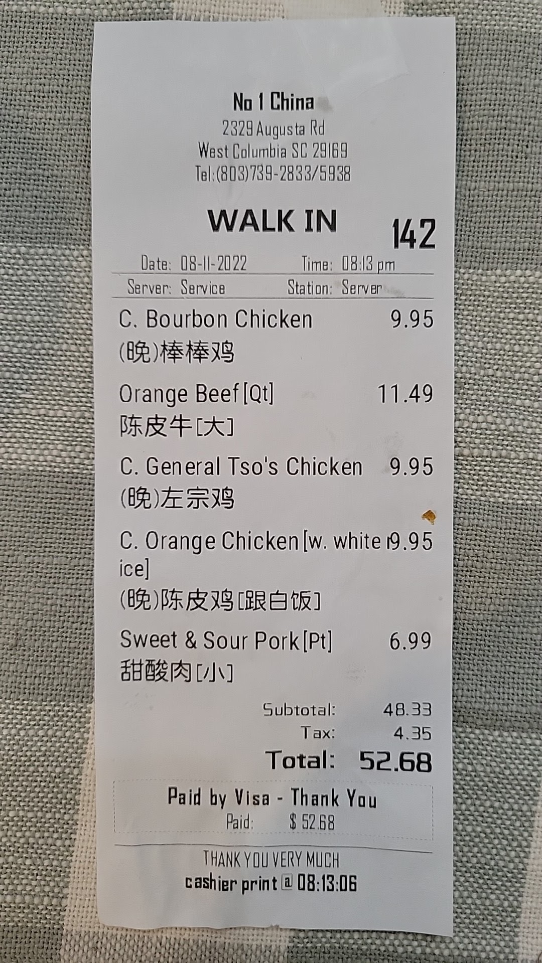 Read moreMy husband and I have been ordering from No 1 China since the day they opened their doors for business ... they have always had the best take out in the area and the food has always been consistent. However, when we ordered last night I have to say it was down right awful ... the wonton soup was basically water with wontons I literally had to add chicken base to make it resemble wonton soup. .. our bone in ribs were severely undercooked to the degree that I will have to put them in the oven and finish them off ... the house lo mein was edible at best and the portion size was about half of what we used to get ... so basically we spent $30 on a very low end dinner. ... this really makes me sad because this place was always our go to for take out ... I don't know what has happened to their quality and consistency but I wish they'd get back to being the best in the area otherwise we will have to take our money elsewhere ......