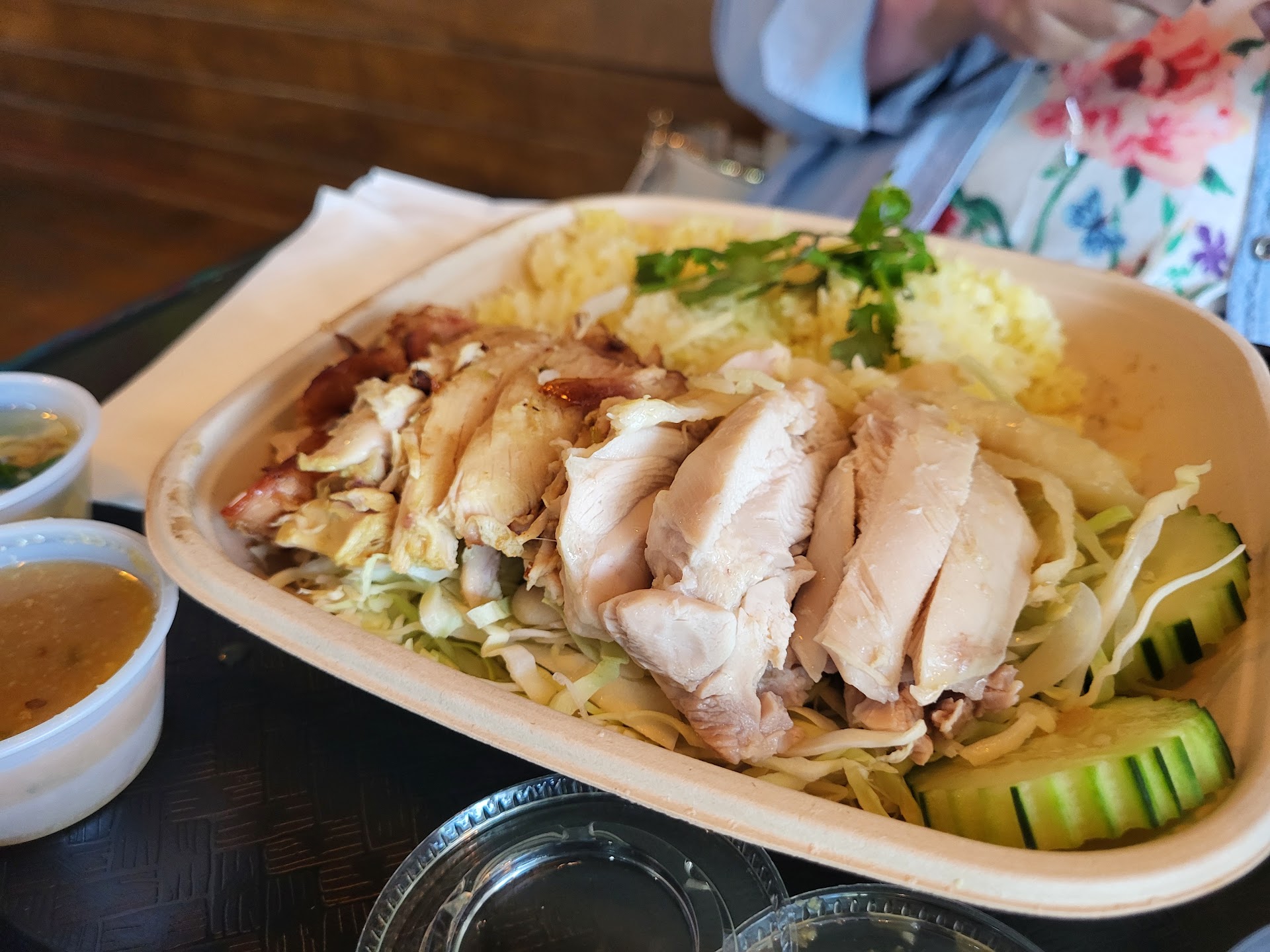 Everything worked so well together! The rice is perfectly flavored, with what I'm assuming is the rich chicken stock. The chicken itself is tender and juicy, not dry at all. The chicken normally sits atop a bed of cabbage, but we prefer to order it without the cabbage. The sauces are just so complementary, and everything just marries so well together. Then the hot, comforting soup is exactly what's needed as the perfect ending to a perfect meal. We're so glad we tried this place. Since we first tried it 2 weeks ago, we've been here 4 times. That's how much we've enjoyed the food.