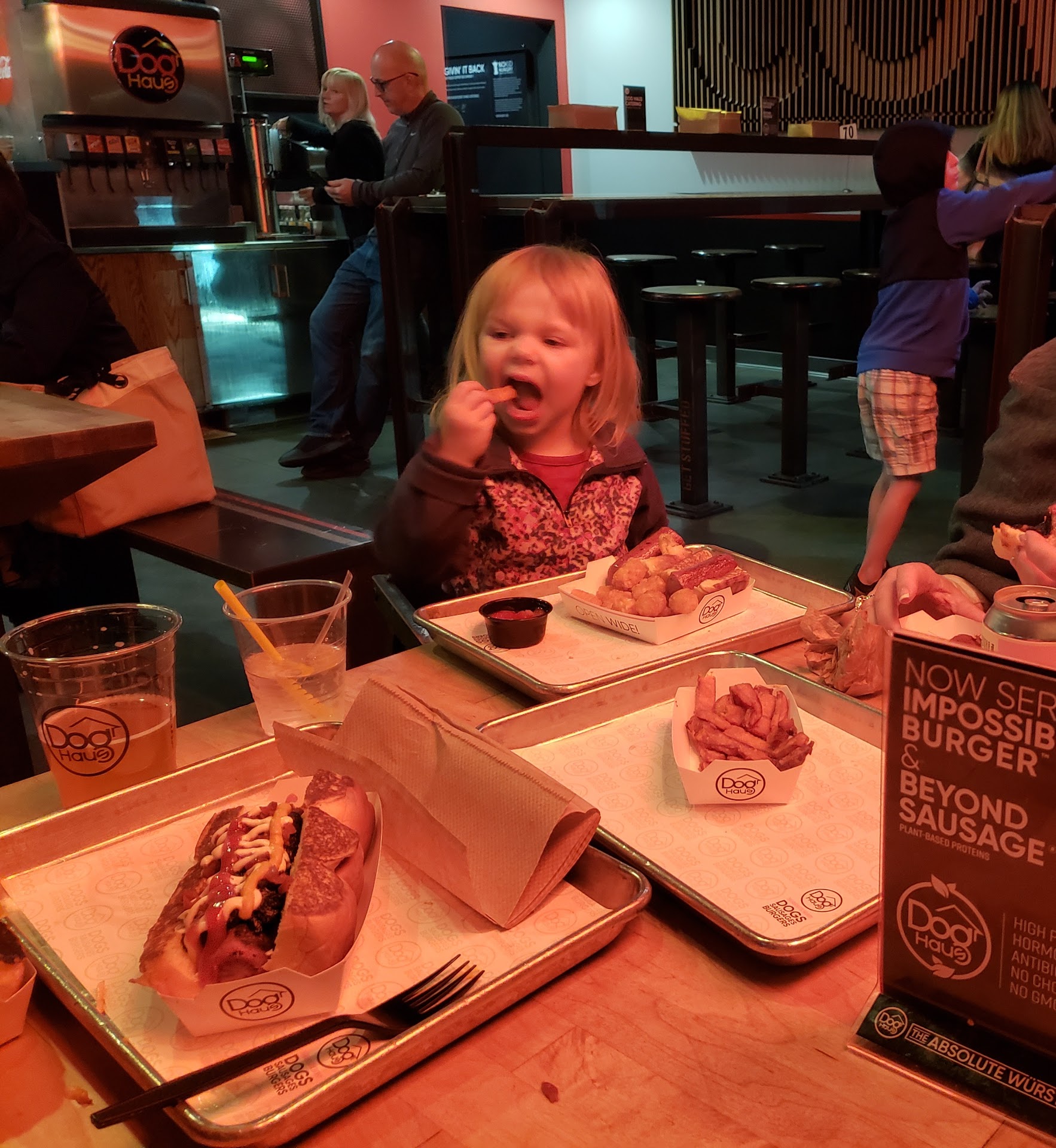 Stopped in for dinner with my wife and 2-year old daughter on Wednesday night before Thanksgiving. The restaurant was hopping busy (always a good sign). Since it was my first time here I ordered a dog a slider and the sweet potato fries. Our order was prepared quickly and without error. 'The Cowboy' dog was properly dressed and tasty. Don't let the name 'Dog Haus' fool you, the hamburger is excellent. The beef in the slider was juicy, flavorful, and cooked to perfection; I'm glad I chose to add it to my order.