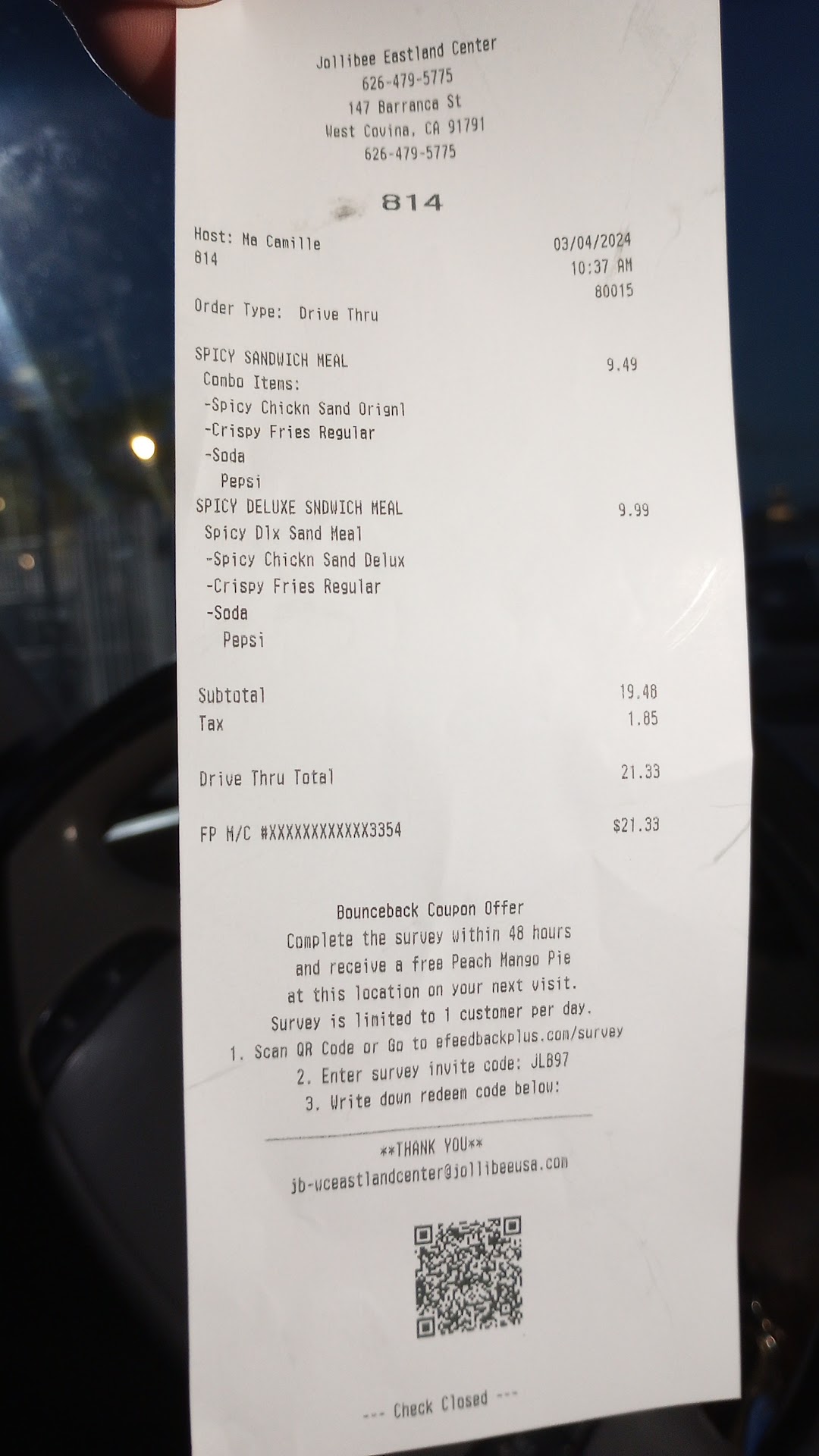 Ā Ā Ā Read moreFirst time trying Jollibee I was excited. Unfortunately, when I open my bag to make sure I had all my items. I noticed my French fries weren't warm. To my disbelief when I tried them, the where absolutely cool. Still in hopes for my first experience to be a good experience, I pulled over in parking lot and exchange the fries. As I walk in I received zero greetings, mind you the restaurant was empty. I mentioned my cool fries to the cashier who also happened to the person who took my at the drive thru window. Again, to my disbelief she did not seem to be surprised by comment. She exchange with a snarly attitude. I became uncomfortable and realized how my first Jollibee experience would be. Through the process of exchange, the 3 employee in the restaurant at the time began speaking in there language while continuously giving me uncomfortable glares. At that time with such discomfort, I decided to wait over in the restroom. At that time I was surprised yet again with one of the restroom conditions and being out of order. I used the available restroom which was not in quality condition. While I was in there an employee was pulling at the door which cause more discomfort. At this time my fresh fries where ready for pickup but unfortunately now at this time my chicken sandwiches where no longer hot. Still optimistic that my food would taste great regardless of the poor customer service experience, I was yet again disappointed. My disappointment was that although my chicken sandwiched was still slightly warm on the outside, on the very inside it was now cold. At this point in time I still ate the meal considering I was still hungry and did not want to feel like I was losing out on money. I was left with not only a bad taste in my mouth, but also was left with a sicking feeling in my stomach. Unfortunately it wasn't just my self who was left feeling ill, my 9 month pregnant partner shared the same unfortunate experience which is my main reason for this complaint. I was told many great things about Jollibee and was excited to give it a try. To my surprise not onlywas I left with a bad experience with the restaurant it self but also left with a discomforting feeling being that the restaurant I visited was next to the Jollibee corporate building on Barrance in West Covina. I hope future customers do not experience are unfortunate experiences. I hope you find my complaint with good intent, My purpose was and is for Jollibee's improvement.