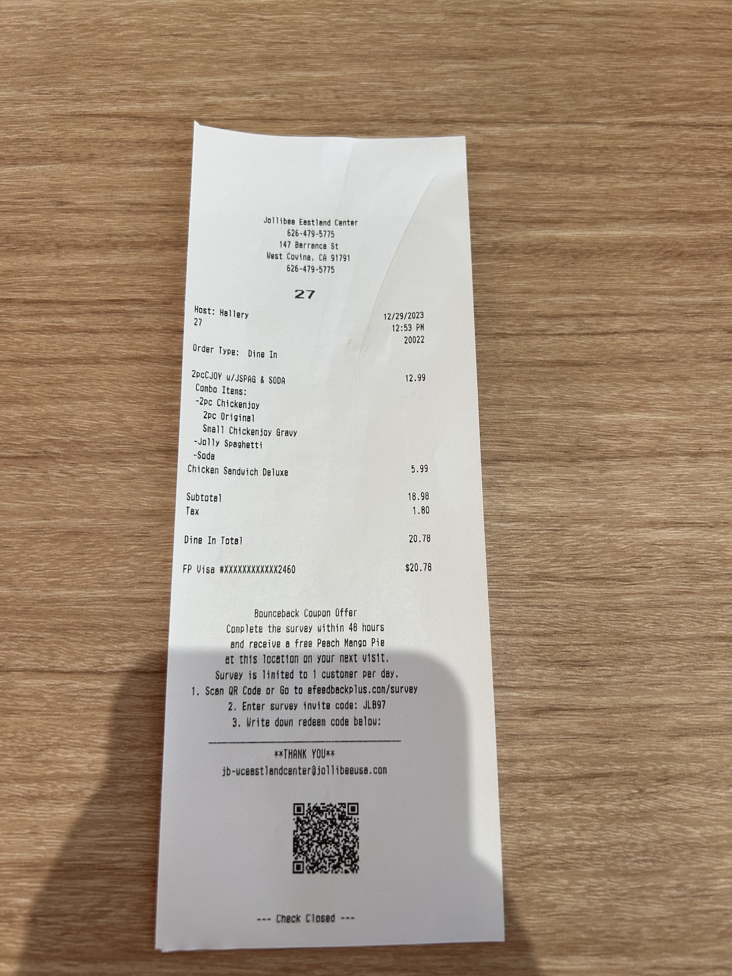About food, looked good but taste is not. It is not for someone who can not tolerate salty and especially for those who has blood pressure. They are super salty, I never need to have drink with food when eating since it is not good to eat and drink at same time for my stomach but I had to grab drink from my husband to drink and tried to finished the burger because it is too salty. I also tried my husband spagetti and chicken thigh, super salty as well. We used to eat Jolibee in OC between Santa Ana and Tustin, food was very good not this crazy salty. I believe they share same receipe but not sure why everything here is too salty like this. My burger came out was almost cold is a minus point again. Hopefully the kitchen can check again food seasoning amount and that food cab serve faster to avoid cold food...