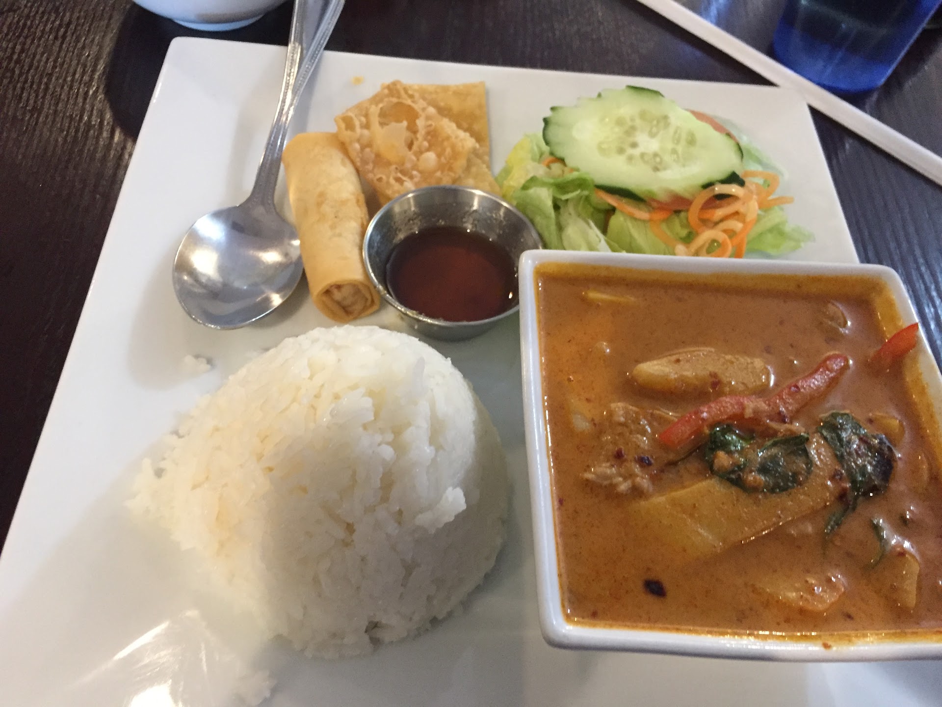 Ordered pickup from here several times and the food's consistently delicious. Everyone in the restaurant is really nice and pleasant, bringing water while you wait and sometimes even Thai tea if the wait's too long. All their curry is amazing - authentic home-made taste that I hadn't had in years. The pad thai and pad see ew are colleague favorites. Just be careful asking for "as hot as you can make it" on the spicy scale, because... wow. And last, but definitely not least, the mango with sticky rice is addicting. I've had to order one for myself secretly because it's gone if I keep it in the bag with everyone else's orders. Going to be trying out the whole menu in due time. Lunch specials are very well priced and adequately portioned for 1-2 people with a salad, an egg roll, and crispy wonton strips.