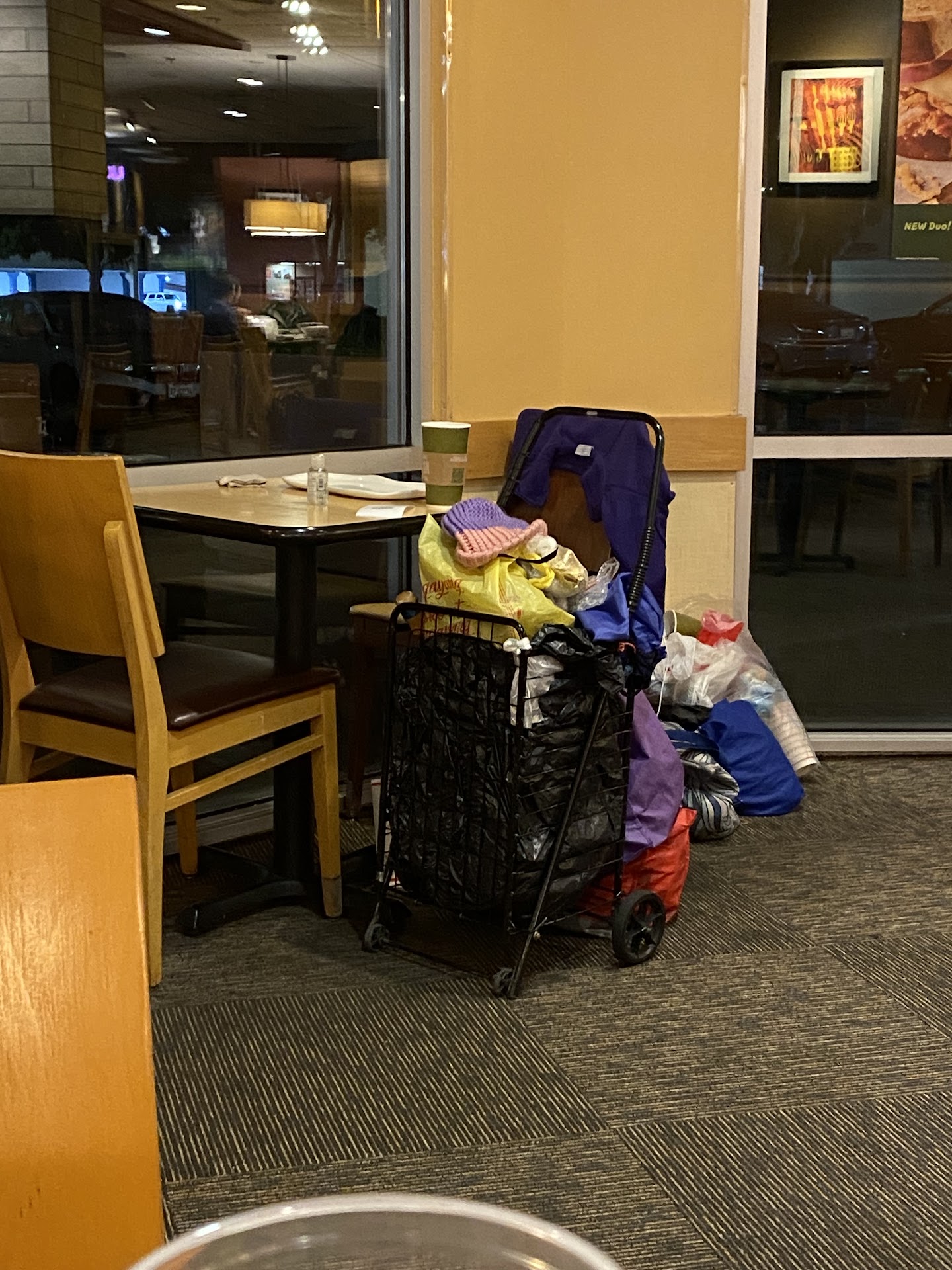 -Homeless People: a number of homeless people roam around inside of the Panera location. This includes a gentleman who lives inside of 2 cars that are regularly parked within the parking lot of the Panera. He has a goatee and long white hair on top of always wearing sunglasses while also always sitting in the sitting area past the self serve drinks area inside. What makes this individual stand out more is how he sprouts out conspiracy theories on COVID-19 and Donald Trump while also having been kicked out the restaurant before in the past (although the next day, he easily comes back in with no involvement from the staff whatsoever). Then there’s a Asian American homeless woman who brings her entire cart inside of the building and spend large days on end inside of the building. There have been at times where she has fallen asleep at one of the tables with no saying from the manager John or any of the employees (even though this is supposed to be a family restaurant and not a homeless shelter). Her cart is in one of the photos included in the review. Another thing that these homeless people do inside is that there have been cases where they’ve have stolen other customers food !!! They wait for when Jon (the MANAGER) is distracted along with other employees and they take the food right off the counter inside. They also take the plastic cups that are reserved for laying customers inside without any intervention from the employees inside.