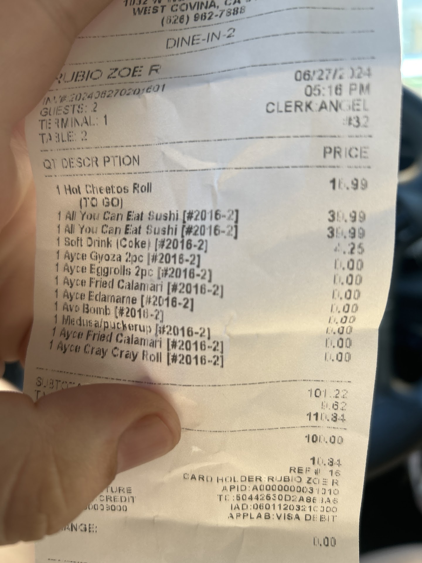 We were still eating but wanted to pay for our bill and buy a roll to take home and we just wanted to close our bill. We were gonna finish eating what we ordered. But Angel looks at my table and goes “are you gonna finish that. Im gonna have to charge you for what you didnt finish. And another coworker comes up(i didnt get his name) and they start watching us very carefully and they were holding my to go roll waiting for us to finish before giving us our food. And as i walked away, i hear them talking behind my back,literally. “They just want the to go box to take their other food home” and that we were trying to pull a fast one. When we weren't. Terrible service. Food was mediocre. Hidden prices and way more expensive than any other ayce sushi restaurants out there. Extremely disappointed. Please dont waste your time and money when there are better options and better service everywhere else How can all you can eat prices were different online then dine in. We wouldve never went in knowing.