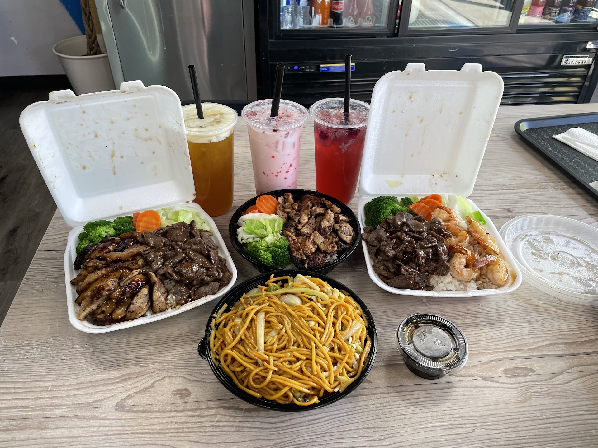 Maybe I visited them at a bad time but the cashier was very distracted trying to juggle three customers at once. The 3.99 teriyaki chicken bowl caught my attention, yet somehow the addition of a $2 milk tea brought my bill close to $8. I didn't care to inquire because frankly, she was difficult to understand. While I waited, a postman whom I believed was a customer, nonchalantly entered the kitchen walked about a bit and finally exited after a few moments. Not entirely sure how sanitary that may be, nonetheless an odd thing to see. The food itself was ok at best, most of the flavor came from the hearty amounts of teriyaki sauce. The milk tea was good though, despite having an initial plastic like taste...probably caused by the plastic lid (user error?). If I ever come back it'll be for...