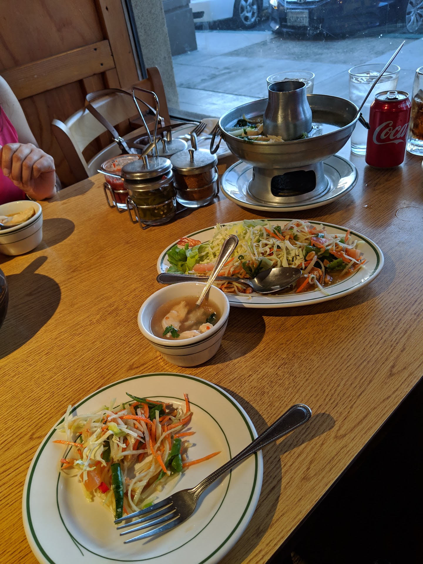 Sat for dinner around 7:30 pm on a Saturday night. Only 1 other couple and our party of four in the intimate restaurant. Cozy, inviting atmosphere. Our server was boisterously friendly, super attentive and very specifically asked us our different spice levels, what protein we wanted in our dishes, drinks, refills, etc. She was quick to make alterations as we worked out our order. Warned us when food/tea was hot to hold. She said she thought she knew us and the restaurant was so delicious and inviting and meant to be I think she did know us in a way 😸✨🍛 My friends and I split Spring Rolls, Pad See Ew, and Pineapple Curry w/ shrimp and tofu. I am weak to spice but the Curry was mild with just a little bitty kick to remind me it was red curry. When I am back in this area I will be...