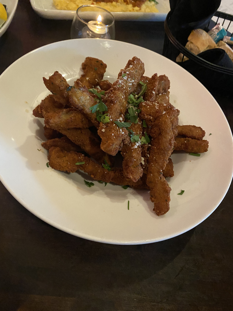 We ordered Calamari Fries and the Meatballs for appetizers - they were served warm, well seasoned and very tasteful. The Calamari Fries are a MUST! Seriously! And the Meatballs were the perfect texture, but they did have a bit of spice to them. I ordered the Salmon and unfortunately it was too spicy for me to even eat, but the Risotto it came with was really good. I just picked at the other plates our group ordered - Chicken Alfredo and Chicken Parm. Both noodle dishes and most prepared and served warm.