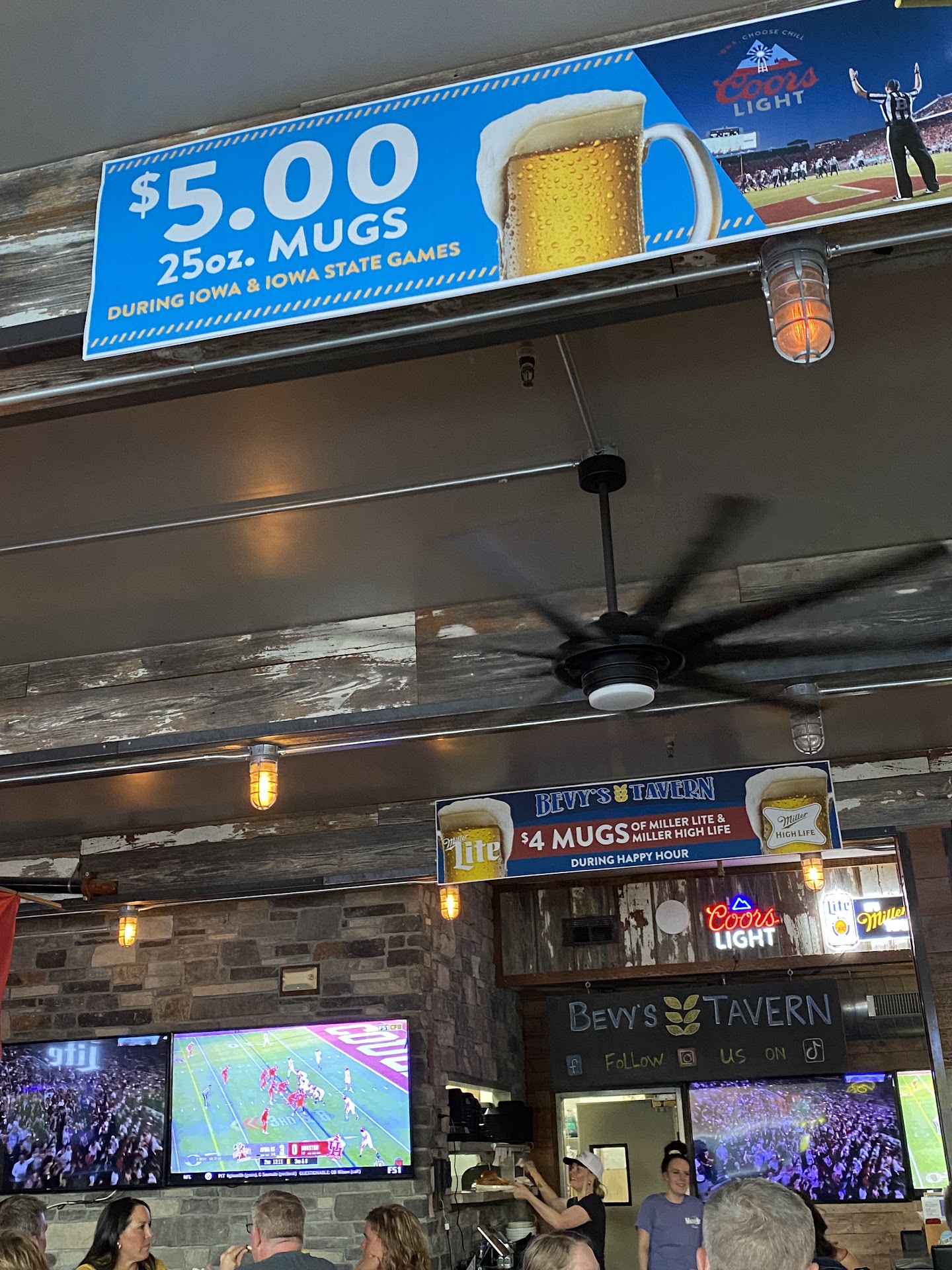We did ask about this banner in the picture, showing that during Iowa and Iowa State games, 25oz mugs are for $5. We asked if that was for domestic or anything on draft. Ashlie's response was that, those are for games on Sunday. Informed her Iowa and Iowa State or any college games don't play on Sunday. So she then said she didn't think they were doing the special. We asked if she could check. She brought the bartender over and pointed up at the sign and the bartender (didn't catch her name), rolled her eyes and said they weren't doing any drink specials. Then why do you have this sign advertising it?! Take it down, as that's false advertising! But seems to be the theme here with the misinformation on the menu as well. That, or just the staff isn't knowledgeable.