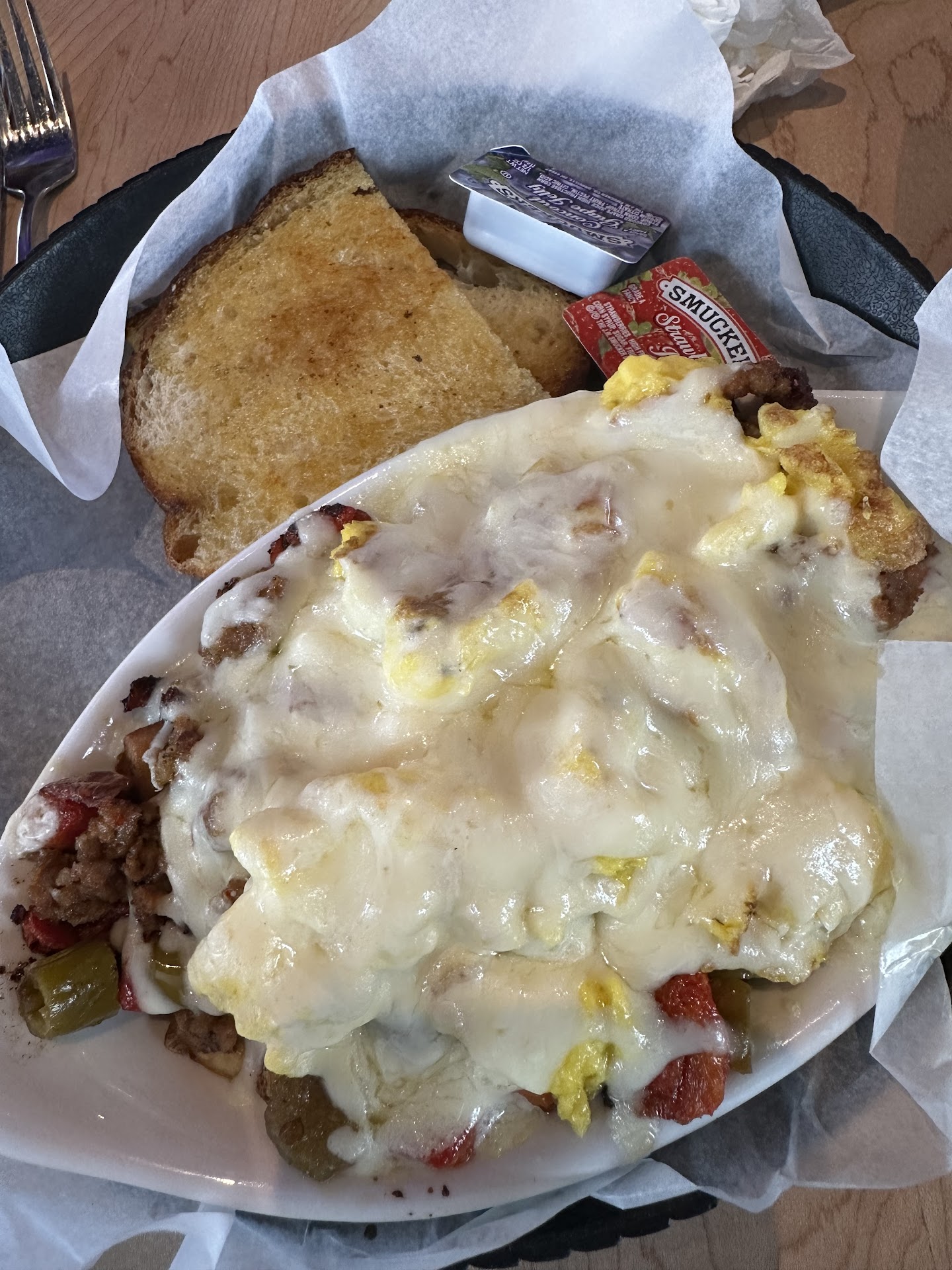 The Italian (pick your) breakfast bowl = loaded with eggs, potatoes, graziano sausage, hot giardiniera, Bix white sauce, cheese and a side of toast. Mmnnnnnn! A great, hot breakfast, flavor was spot on. The only thing that could’ve made this better was topped with a runny egg instead of scrambled, but that’s just my personal opinion.