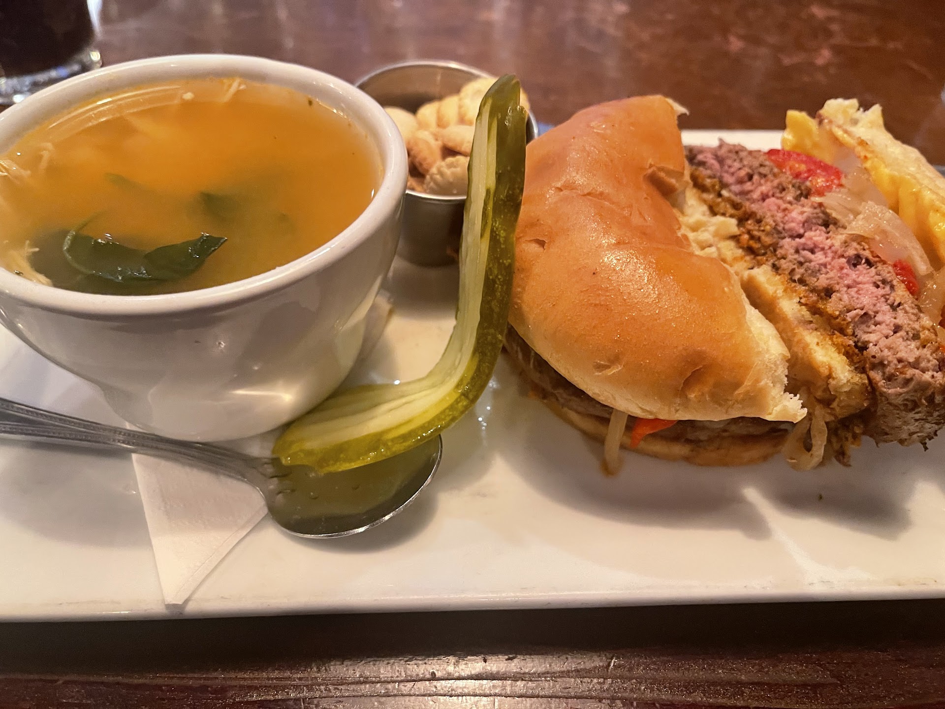 The meat loaf was very moist, tender and tasty, with just the right amount of peppery glaze to give it a kick. White cheddar and American cheese slices were melted over the top - all of which was topped with a very tasty cole slaw. And then there was that loaded baked potato salad that was unique, tasty and just the right portion size. Think of a loaded baked potato squished into a small bowl with some relatively raw onions mixed in for taste and crunch - loved it! My wife also liked it much better than her burger and helped me eat it. Her burger was average, cooked beyond the medium rare that was ordered and a little dry...I would take the meat loaf before it any day.
