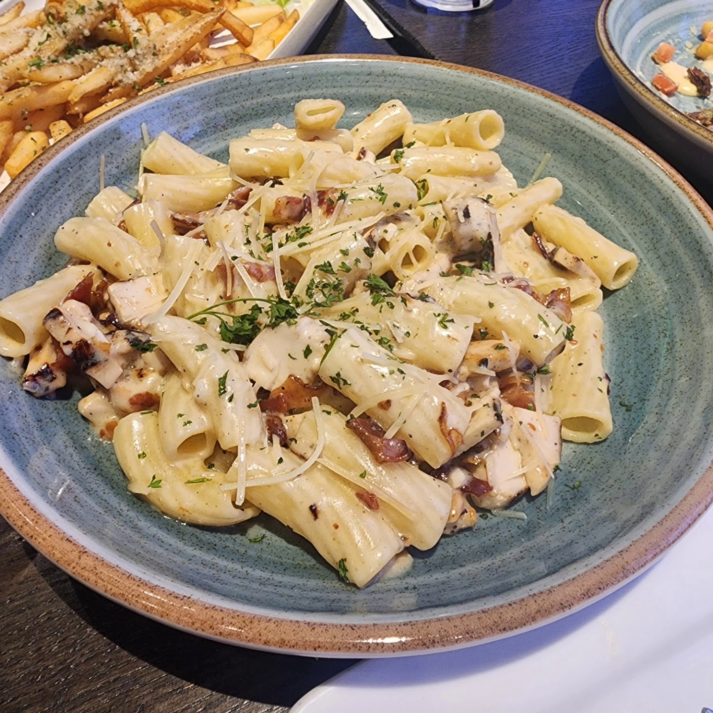 The server finally gets all of our orders and puts it in. The food was horrible. Things came out soggy, under cooked, or over cooked. My BBQ chicken flat bread pizza had 5 chunks of chicken on it in total.