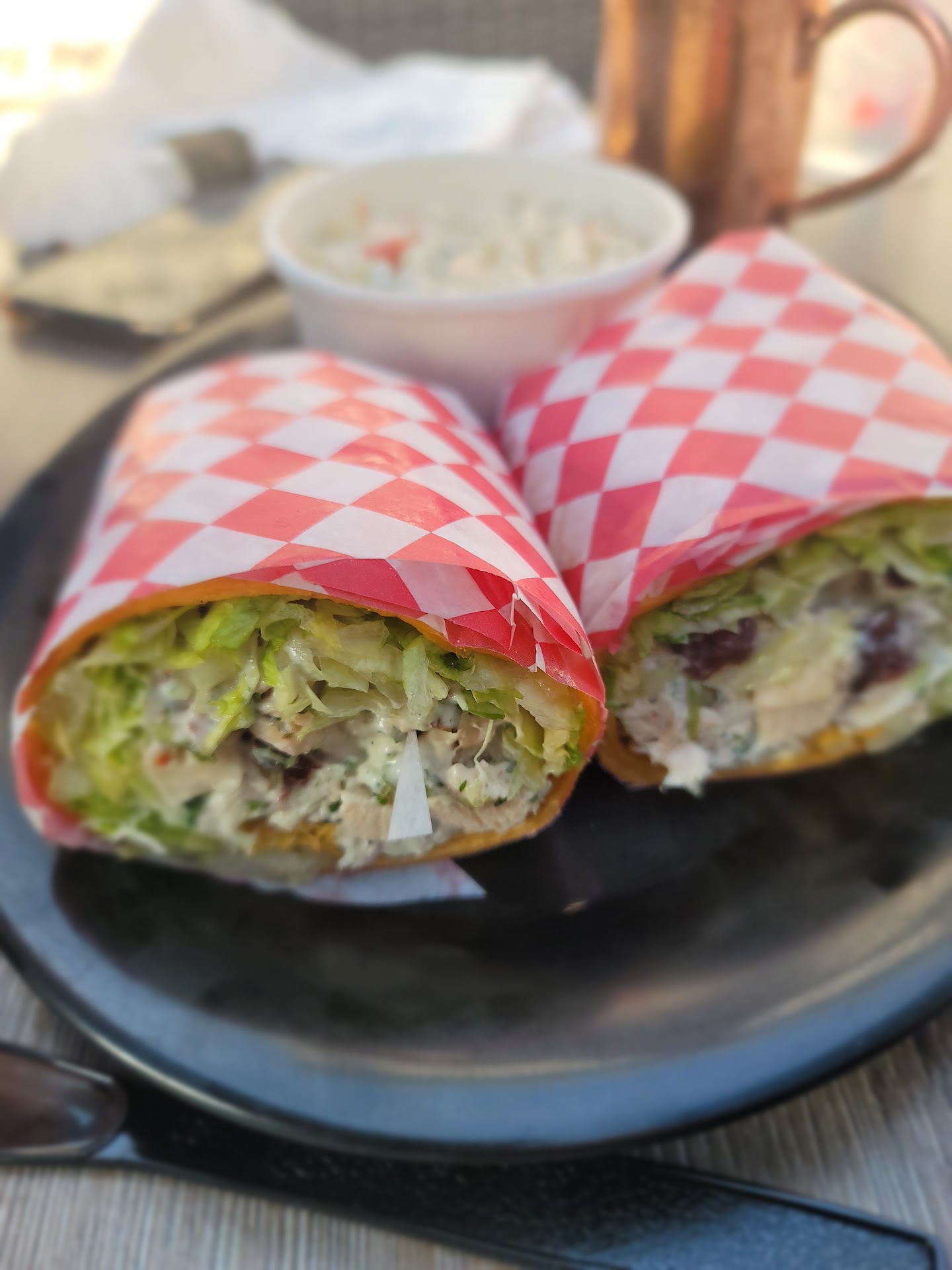 Let me start by saying, I do like this place and so do others as every time we stop here it is packed, which isn't saying a lot as the place is small. We arrived with the intention of sitting on the outside patio. Timing was perfect as we walked out a couple was leaving and offered us their table. The waitress was extremely attentive which was a great sign. She took our drink order and returned in record time with our drinks. We were still checking out the menu and she said she would return. My wife ordered a mulberry mule drink at the recommendation of the waitress and really liked it. That is where the waitress' attention diminished for us. She walked by numerous times and even though I pointed to her she would walk back the other direction and not even look at our table. I will admit it was busy but it almost seemed deliberate at one point. Finally, we got her attention and my wife ordered the Chicken Salad Sandwich in a wrap and I ordered the Walking Taco Nachos. My wife enjoyed the wrap although she thought it was missing something and seemed a little fry. The Nachos were right on. It was a heaping plate of dorito style chips with queso, jalapeños and shredded cheese all layered on the plate and covered in lettuce. Every chip had topping on it. I would recommend the Walking Taco Nachos, just make sure you have someone to share them with. The patio area was delightful, umbrellas to block the sun and a nice little breeze going through the alleyways make it really comfortable. Highly recommend as the food us good, finding a place to sit can be uncomfortable. I would have given it five stars but the lack of attention seemed almost deliberate. We...