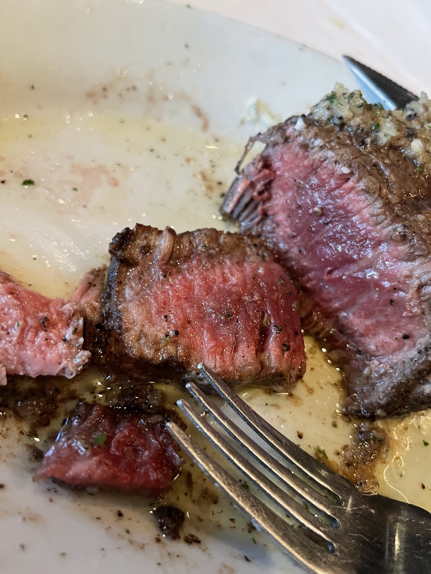 Our steaks finally arrived at the hands of another waiter who did not know who ordered what and warned us that the 500-degree plates should not be touched. Our waitress came shortly after to ask if we needed anything but forgetting to perhaps ask us if our steaks were cooked to our liking. She then disappeared for some time. We attempted to grab another waiter’s attention, but they seemed quite busy and had their hands full as they cleaned up from a larger table that just left. When she did arrive my wife and I had shared about 2/3rds of my steak which was cooked mostly medium rare but lacked any type of sear that would likely come from a 1800-degree broiler. My wife’s steak on the other hand was a cool purple on the inside and she apologized taking the plate back to be cooked further without asking if we wanted it at all. The table behind us was now going to pay their bill at the host stand because their waiter was nowhere to be found. My wife and I were now ready for this evening to be over.