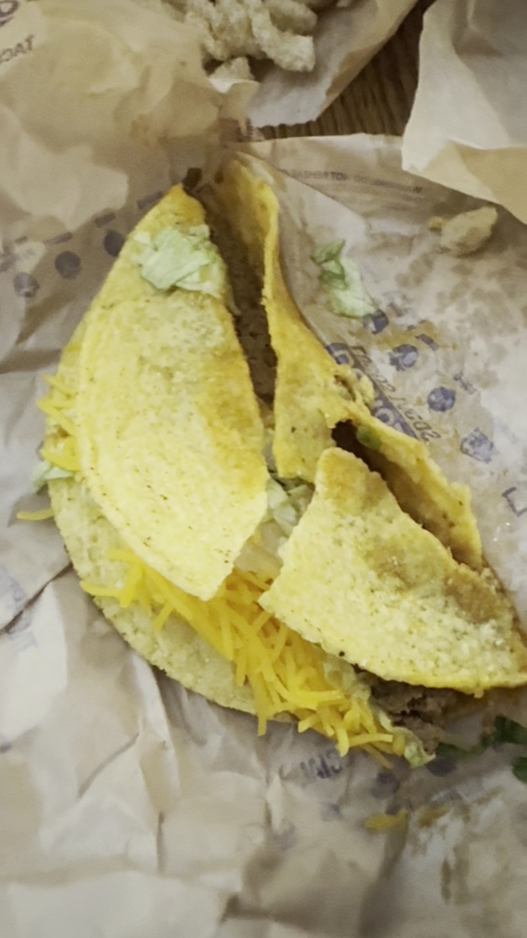 Read moreI placed a mobile order ahead of time. Swinging through the drive through was easy enough. Though if I had known the horrors that were to come, I would have turned right around and went to Culver's down the street. Service at the window was minimal, quick, but not rude. After receiving my order, I pulled over to make sure everything was correct. Immediately I notice that I haven't been given any napkins or the sauce packets I had requested. This was unfortunate foreshadowing of what was to come. I first approached the potatoes which were typical taco bell affair, though a little dark. ( I think the fry oil needs changed) I moved onto a very sad and cold 5-layer burrito. One bite, and I can't muster the courage to take another. Disappointed I moved onto the specialty item of my order, the " steak grilled cheese burrito. " At this point I was joking about the cheese roll up side order being the most edible part of my meal... Too soon would I eat those words, and would not be eating much else, because the state of the burrito killed one of my childhood memories. Idk which one, because it's gone now. This was depression in a foil wrapping. There was not even an attempt to grill this poorly wrapped underweight burrito. Loose three cheese blend was falling all over my lap, as I realized I had dredged the depths of fast food despair. I took a sip of my mango Brisk, which tasted slightly off. Next I march inside, set the bag and drink on the counter without saying a word and head to the bathroom to wash my hands of this sad event figuratively and literally, vowing to write a review, rather than expressing my grievances to the young wage slaves. (who certainly are not paid enough to care) I will not be returning to...