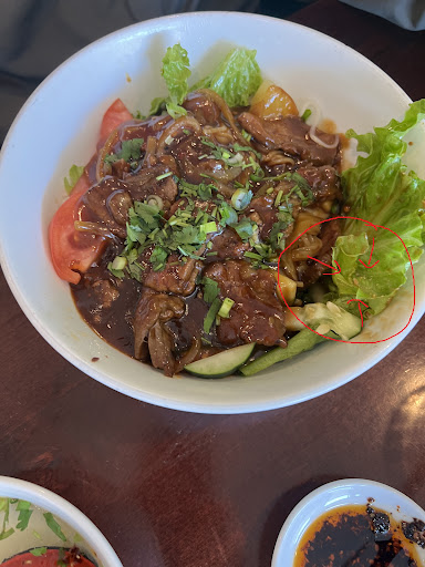 It's sort of like Hunan beef on noodles, and is completely filling and delicious... it's a steal at 10 bucks. Having those fresh veggies, including a few chunks of pineapple and slices of cucumber, really as a nice contrast, it makes the dish both savory and refreshing.