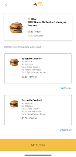 My order was off the app as youâll see in the attached photo. I used the BOGO Bacon McDoubles deal that I always use and I customize it with: No mustard, ketchup, or cheese Extra onion And extra spice pepper sauce
