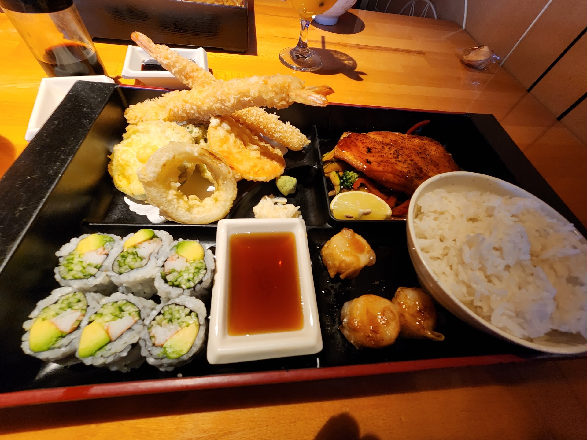 TLDR; terrible service, management, morality, and mediocre at best food they charge a lot for. The server had no idea what the second appetizer was, she didn't refill our water in the hour between when the soup and salad was served and the first entree came out, did I mention the food took over an hour? I understand the restaurant was busy but we were told if we didn't sit at the hibachi grill we could be seated and served almost immediately while it was an hour for the grill, well we could've been at the grill for almost an hour by the time the first entree arrived, alone, without its side of rice meaning it had to be eaten alone or cold by the time the rice eventually got there. The next two of four entrees came in, still no rice for the first. The fourth entree came out almost a half hour after the first and finally the side of rice and seeing as I found a piece of the third order in the fourth I don't understand the time discrepancy. The green tea was bitter and had an almost moldy flavor overall smelling slightly of sewage. One of us ordered the steak medium rare the other medium well, and both were well done. If they are going to charge more for fillet minion don't overcook it to the point the increased tenderness is irrelevant. The shrimp was over cooked as well. The miso soup was just broth and the salad was iceberg lettuce with a third of a slice of a tomato. I can't make this up. Some one in our party told our waitress that the discrepancy between the advertised table time, grill time and actual wait time was unacceptable and she apologized and she, our party member, said she understood that a lot of what happened was out of the waitress's control, which though true was generous,and would like to speak to management as it was also poor management. Enter the managers stand in, the hostess who had told us sitting as the table would get us quick service, saying the manager was out for the evening and the waitress is new and she should have been trained better. Apparently she though this was some kind of golden explanation because when asked simply how the promise she made and the speed of the kitchen weren't management issues she looked like a deer in the headlights, too bad throwing the waitress under the bus didn't work. As if poorly trained staff on the floor isn't also a management issue. The best part is when the waitress came back we mentioned the manager and she asked if we wanted her to get him, we said we were told he was out, and she stumbled and said "um yeah, he's on a delivery but he'll be back soon and I can get him then." Either he was there and as disappointingly low quality as his food and service or gone and who would trust anyone's concept of time at that restaurant. Either way I wish I could leave zero stars and I would not recommend this restaurant to the starving, it'd be quicker, more satisfying, and tastier to grow your own food or do what I ended up doing and go next door...