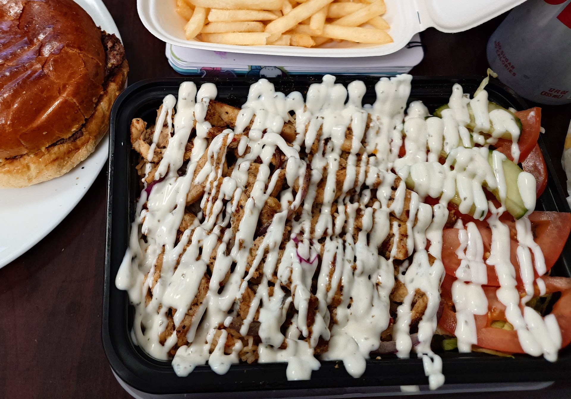 I'm so glad we have a place that makes a solid shawarma sandwich and chicken over rice!!! I know my photo sucks but the food was really, really good. I've had the beef shawarma sandwich and it was great. Chicken cutlet sandwich and cheeseburgers are also fantastic. It's kind of hard to tell what they sell from the outside and their menu is a little hard to parse, but everything I've tried so far has been amazing. My favorite so far has definitely been the chicken over rice though. It's better than a lot of the NYC carts, even the famous one near MoMA which is honestly pretty dry. The guys who work here are also super nice with great customer service. I also like that this place is more casual and has pretty long hours. It's good for people who live in the neighborhood. Generally I don't want to have a huge event of a meal, we really needed a casual restaurant like this for when I don't...