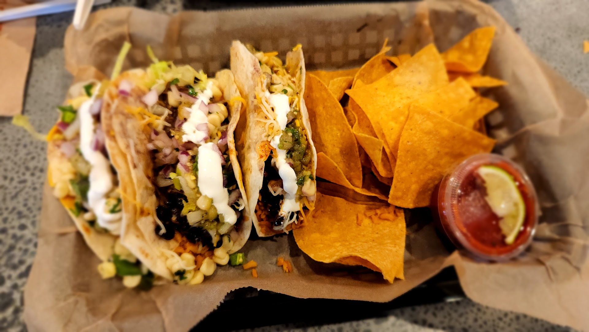 So for my meal I went with the tacos, you get 3. Just like other places you can load it up with whatever you want, I went with Spanish rice, black beans to start. For meats I tried 3 different kinds, one for each taco, so I got Baja chicken, BBQ shredded beef and then Achiote Pulled Pork. To finish off the tacos I added shredded cheese, corn salsa, medium green salsa and some sour cream. All of the tacos were very good, each of the meats had a different but very good flavor, plus they were quite filling. The chips were also good, and you can add on guacamole for extra if you would like something more to dip your chips in.