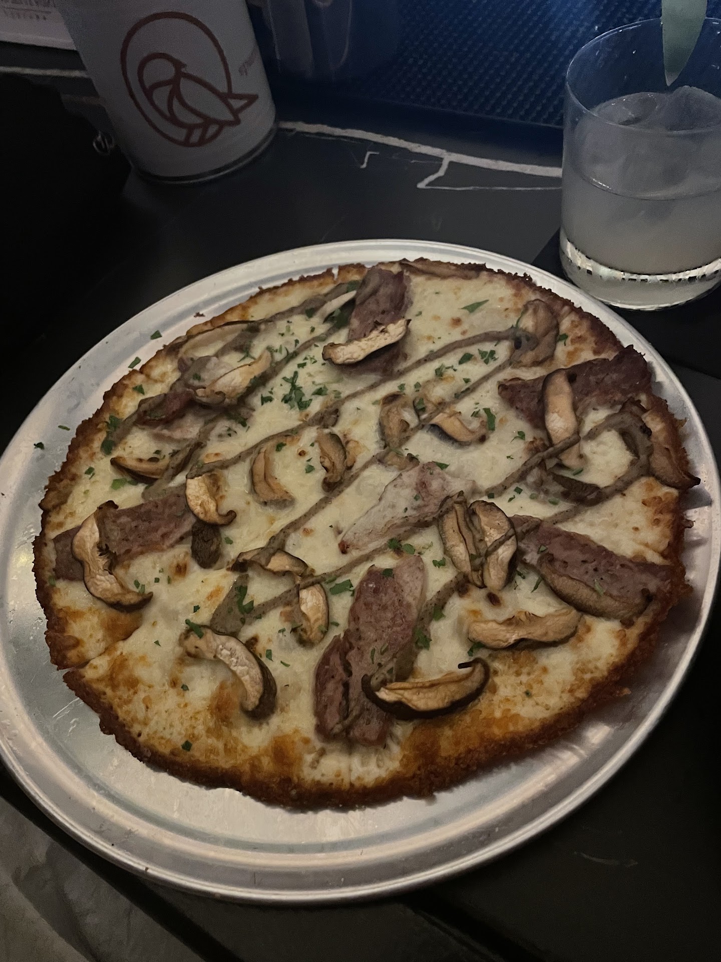 Read moreI saw this new place on Facebook, so I wanted to try it out with my husband. We made a 7:45 reservation, and when we got there,we were told it was still going to be about a 30-minute wait. Luckily, a high top opened in the bar, which we were able to snag quickly. The menus were hard to read with the color of the font and the low light of the restaurant. I went to use the bathroom and almost ended up in the BOH area. I wish there was better sinage for the restrooms. It was hard to figure out who was part of the staff. There was no uniformity to anything. I felt like it was a free for all for attire, especially for the bar tenders. The restaurant was loud and noisy, I pretty much had to yell at my husband just to have a conversation. The food was quick to arrive. We ordered the mozzarella sticks and 2 pizzas. The mozzarella sticks were average. Half of them were overcooked and partially exploded. They were your basic mozzarella stick, nothing fancy about them, besides having a skewer in them, that really didn't serve a purpose. I was looking forward to these pizzas because I typically love a thin crust that is crispy. The pizzas were thin, but the bottom crust was lacking in the crisp department. I honestly feel like these are pre-made crust. The ingredients on the pizzas were nothing that wow us. Yeah great you have dips and drips to accompany the pizzas but the overall pizza wasn't great to begin with. My only favorite part of the pizza was the crispy burn cheese edges. For my first time I wasn't that impressed with the restaurant but I am willing to give it another try once it's the "newness"...