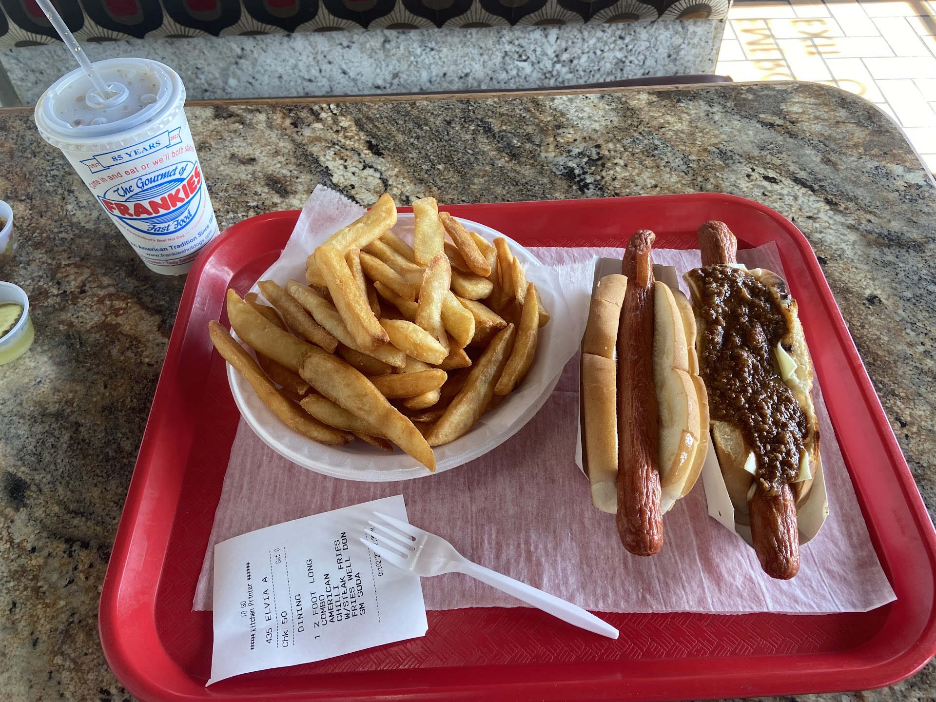 Read moreWe absolutely loved the idea of everything. They had lots of options. We tried a Georgia dog with chili/cheese, an Irish dog, a Mac n cheese dog, a chili dog, a plain dog, and garlic parmesan wings. We thought that the Long dog was special, but all the dogs were foot long, so we over ordered some. To us, the dogs had no flavor. They tasted like a 1960's hot dog on the heat light spinner in a movie theater. The chili was good. I really liked their home relish at the condiment counter. My son liked his Mac hot dog, and d daughter liked her wings. Steak fries were ok, better with a little salt and dipping I. ketchup. Staff was a 5 🌟🤩. She was super patient with us and answered all our questions. Looks like this place has been opened since the 70s and kept the same decor and seating. Little run down, not dirty, just old. Was...