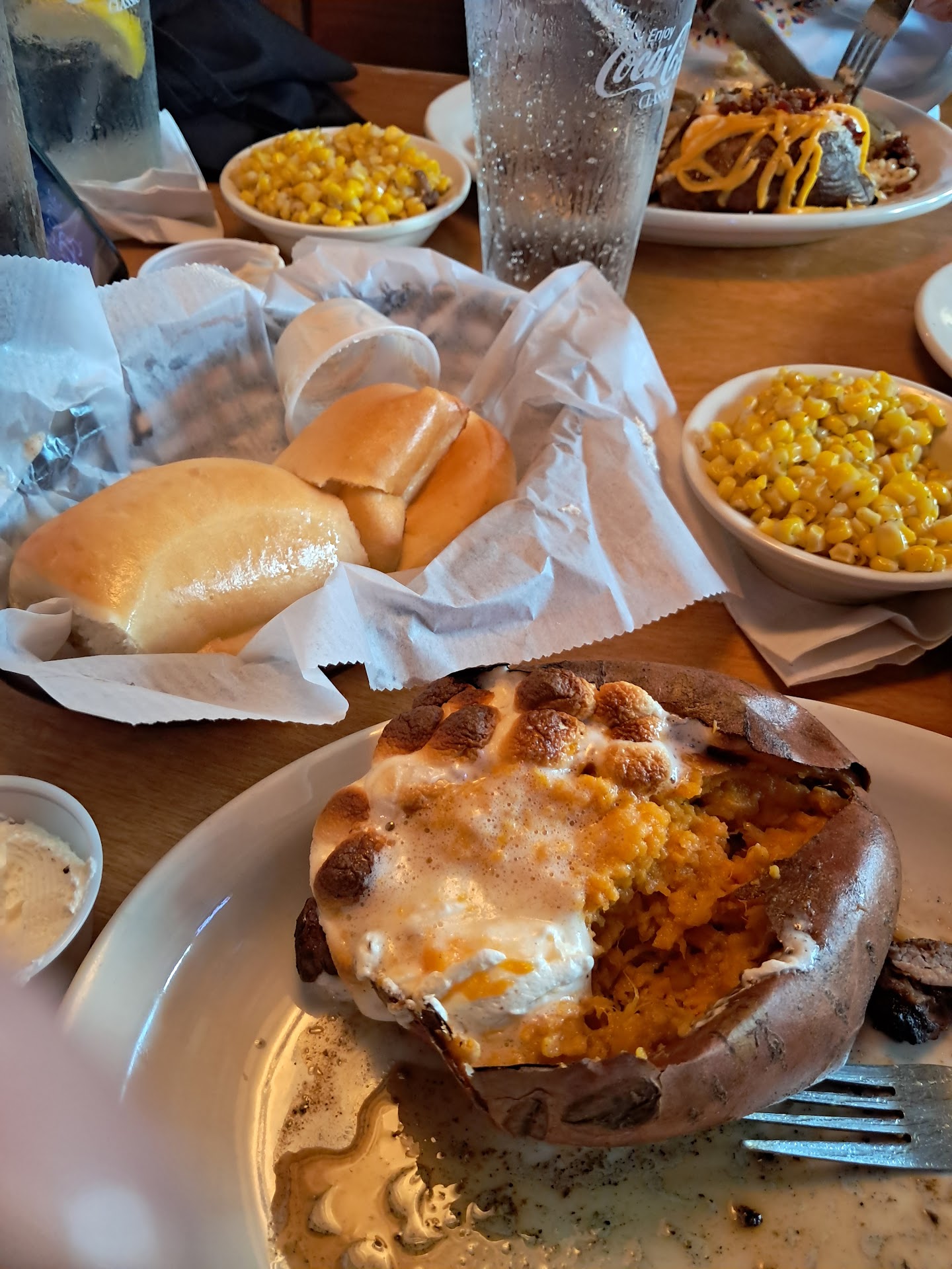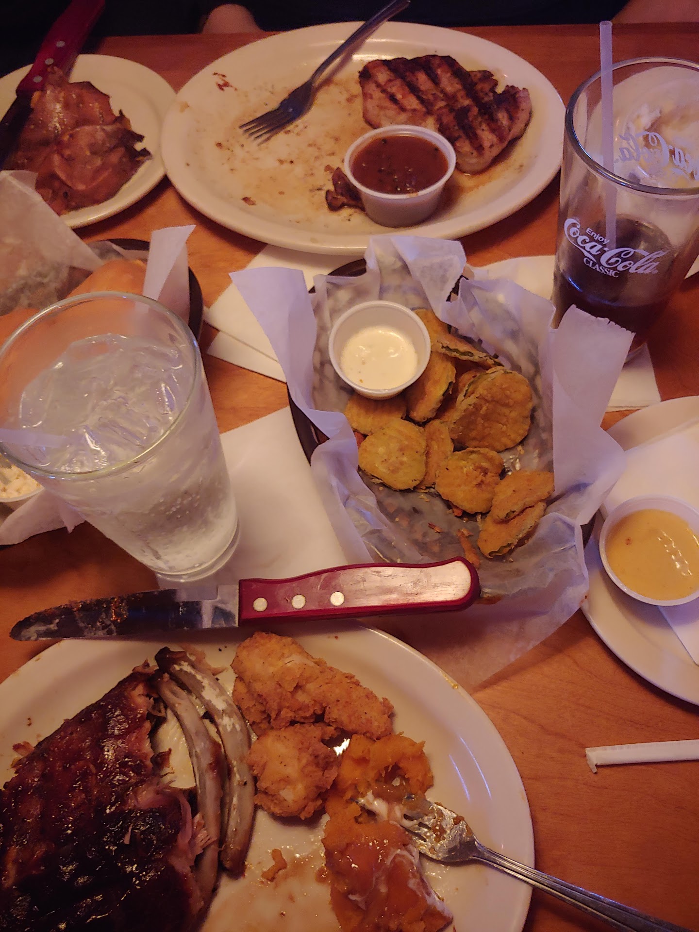 Read moreBrought the family and relatives for dinner Friday evening July 25th sat down and ordered. At one point during the order process my wife ordered 2 Texas size combos. One was full slab of ribs with sirloin the other chicken critters and sirloin. Other items and sides were ordered and the waitress (Karen) repeated back the order and incorrectly stated fillet with the combos. My wife corrected her and repeated back the original order of sirloin for these combos. Food was delivered by another person, not the waitress. I glanced at one of the steaks which was a sirloin and assumed the other was the same. At one point while eating a serving dish was dropped on one of the family members as the waitress/waiter station was directly behind their seat. Luckily nothing was on the dish and no mess was made, neither was there an apology only giggles by Karen and another waitress. Only one visit was made by the waitress to refill drink/water or to check on our table. Upon reviewing the bill we noticed the two aforementioned combos included fillets. We notified the waitress of the error and asked that it be amended. She said she will not change it because that is what we ordered. Asked to speak to manager at which point she said if she has to get her manager, we would have to pay the full amount. A few minutes later a manager arrived and we addressed the issue which he corrected the bill. Used the men’s restroom prior to leaving and the floor was extremely slippery like grease was on the floor. Toilets are leaking near...