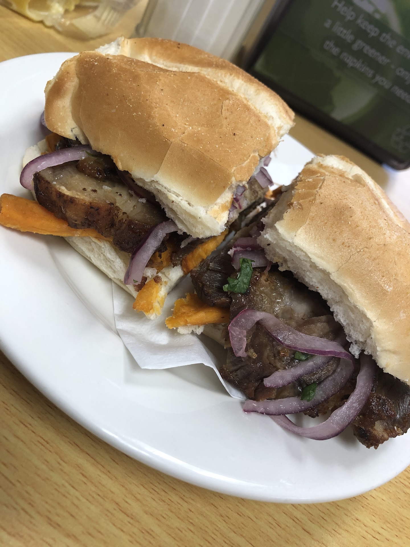 Absolutely love this place! The owners are super nice and you can feel the family vibes when you wall in. They have a shop side for latin cooking essentials and a restaurant side where you order different sandwiches and desserts. I had their chicken salad sandwich and it was AMAZING.The best chicken salad I've ever had. My friend had the chicharron sandwich and I had a couple bites of hers and it was also SO GOOD! This place knows how to pack in flavor. If you're looking for a place to grab a bite this is where...