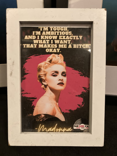 Then, there's the aural experience. True to their name, these Fan Girls (biz- & life-partners Betsy & Cynthia) are fans of girls who make music! A single flat screen tv plays videos of the songs. And much like the lighting, the music is the perfect volume to set the tone without overpowering conversation. The walls display framed original art: photography, paintings and digital art (all for sale) paying tribute to women rock, r&b, folk and pop stars. And we're not done...