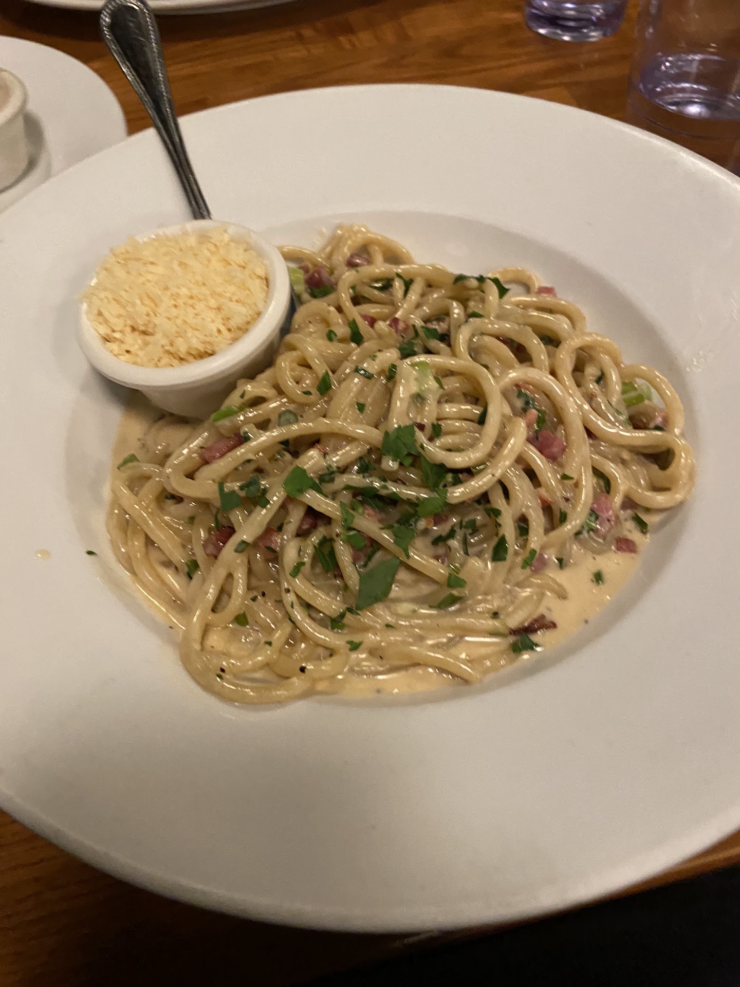 Finally got the vegan sparkling wine and waited for our appetizer which was the was the vegan Mac and cheese well that turned out to be the non vegan version and we would know as we are very aware of the difference, so we ask another waiter to take it back after we had already regrettably eaten some of it.