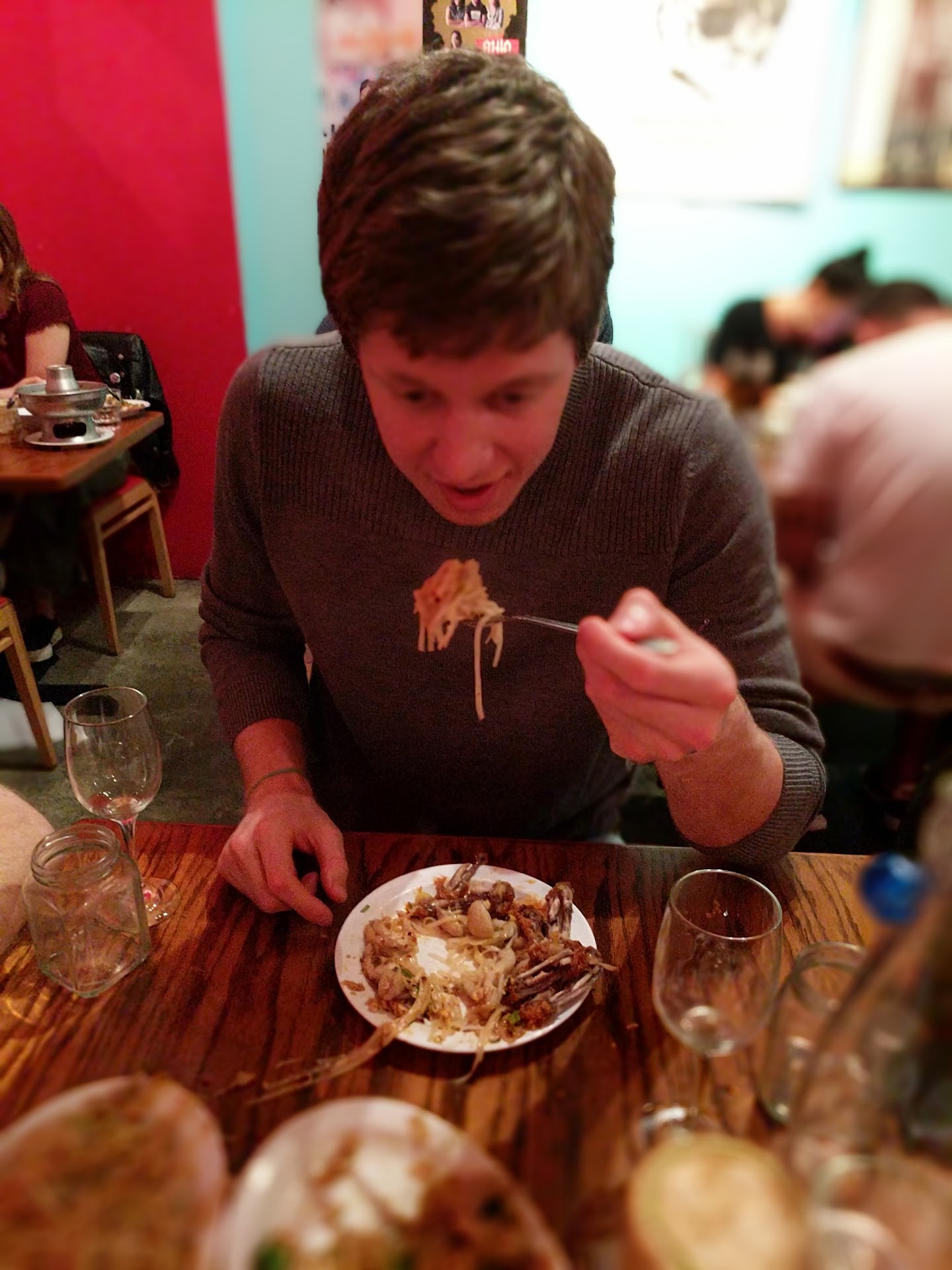 Part III This is were the drama begins. We were eating quite a delicious meal, but things naturally got quite messy. We were each allocated one paper napkin at the beginning of the meal, which was soiled within minutes (see the fifth photo). We asked for more napkins for the table, and were provided with a fresh plate, upon which a single, neatly folded napkin was placed (sixth photo). A single napkin for a table of four?? Apparently Night and Market harvests their own pine trees in the parking lot out back and is worried about running out of paper. Fortunately, the table next to us had just left, and had been so kind as to leave their used napkins behind. Like any man with very little self respect, I had no choice but to use the pre-used napkins from the table next to us...