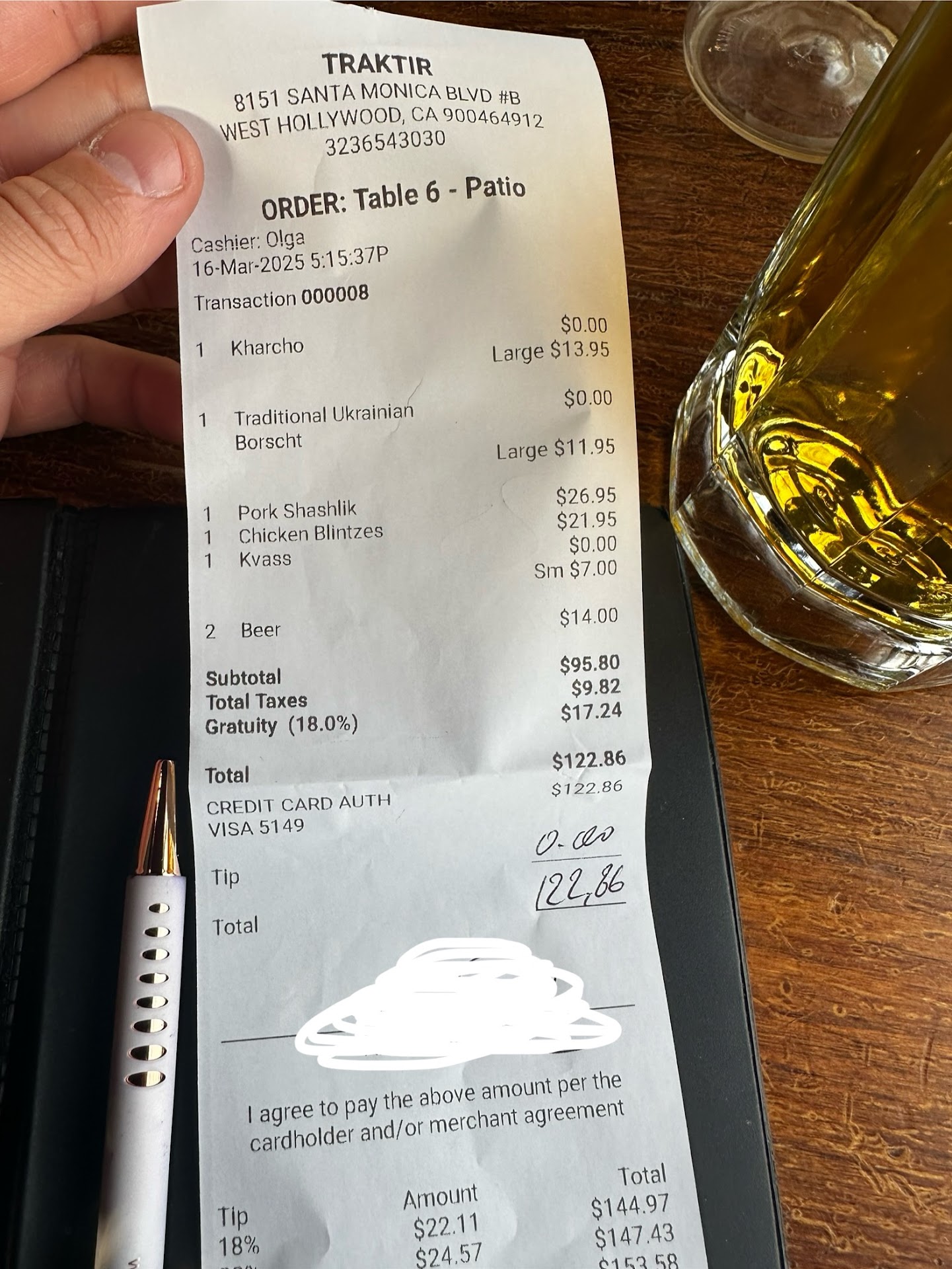 We were just two people, but an 18% tip was automatically included — without any notice. Maybe that’s normal in LA, but it felt off. What really bothered us was how the check was presented: it was folded in a way that hid the breakdown, showing only a line suggesting another 18%, 20%, or 25% tip.