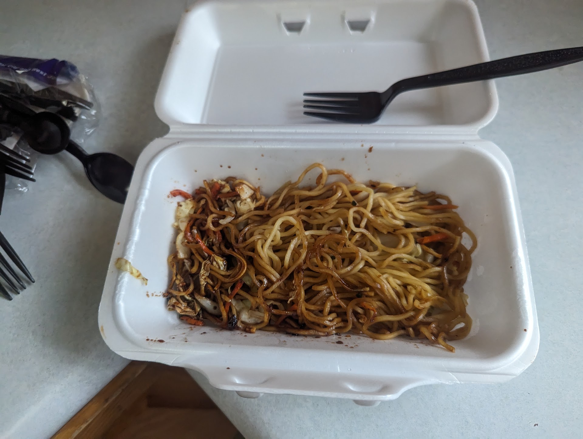 Imagine a stir fry with less noodles than a pack of ramen (and the same quality). A stir fry that hasn't even been stirred to coat the noodles with sauce. A stir fry with a couple shreds of cabbage (I think) and nothing else.