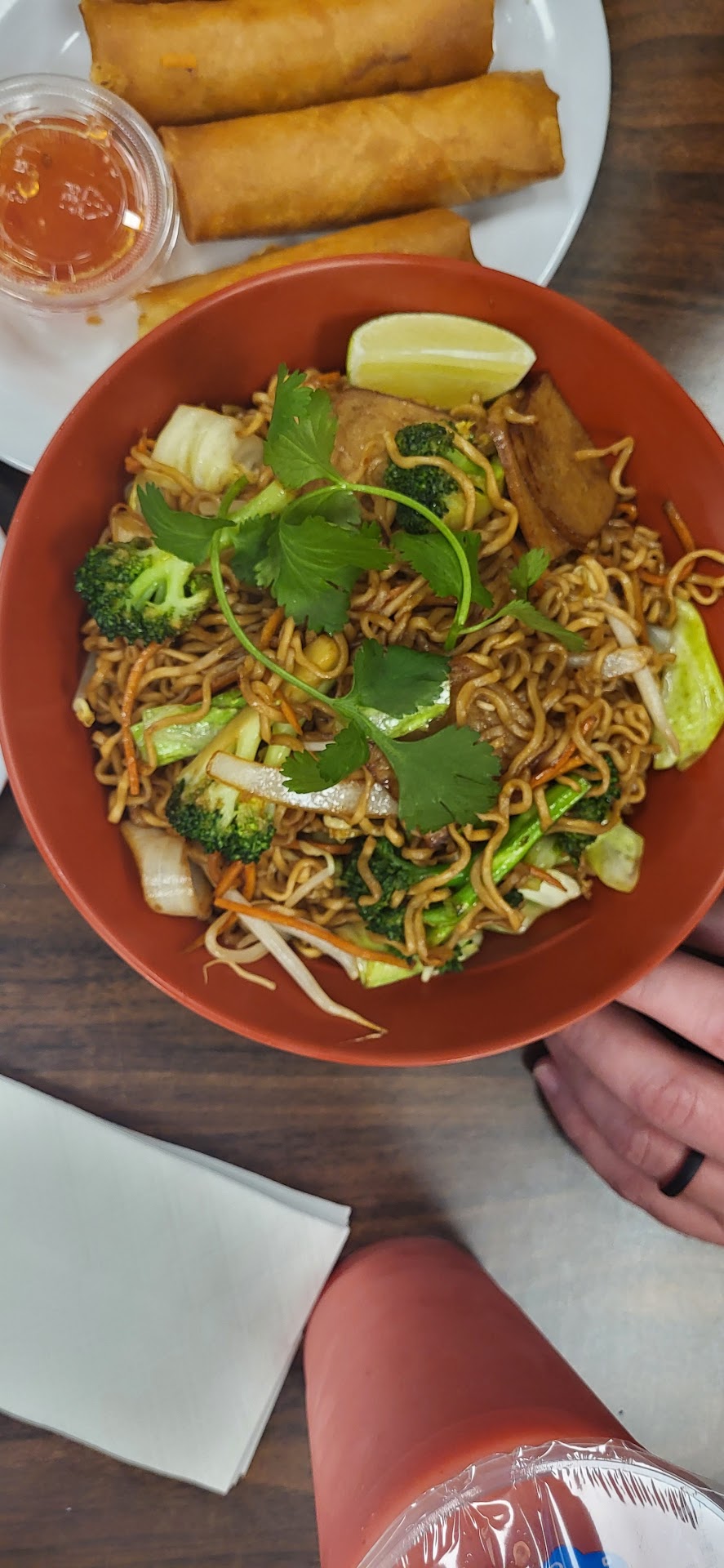 There were 7 of us. The place looks clean from what we could see. The service people were friendly and helpful on out 1st time there. Also quite a few tables so enough room for a bigger bunch like ours. The food was brought out quite quickly. The portions were on the larger size. We ordered pho (however you spell it) those who ordered it said it was good. The rest of us ordered the vegetable ramen. It's flavor was just OK but there were very little vegetables compared to the ramen.....for the $10.00 price we were gipped- there was more veggies in the pho then in these bowls---hmm mm for a vegan restaurant I was surprised. We also ordered the shrimp side....there were maybe 6-8 pieces of shrimp, came out quickly, small pieces, $12 price was fairly high for size, taste was ok. Then we ordered a few tapioca smoothies....hardly any flavor and a grandchild said it looked like it was moldy on the bottom from not being blended properly. But the real kicker was the flies that were flying around the table area. There were at least 6 flies in there that would not go away, flying all over our food, our heads, even our feet. I brought this to the attention of one of the workers there and he just laughed. That was the last straw......we will NEVER return to this restaurant. Why such a big deal.....Our daughter got a parasite from flies that landed on her food and ended up very sick for 2 years. She will have this parasite in her body for the rest of her life, so we are very weary when we see flies around food and in food establishments. But for the guy to laugh when I mentioned that they had some flies that needed to be killed, well that was all we needed to nail the coffin door shut on this place. All the beautiful food, the quickest of service. The helpful service members in making our choices. The good or not so good tasting of food. Anything right next to being served food on a gold platter would not help their review because of the flies. Flies carry disease. This needs to be addressed. Sorry guys but I give a...