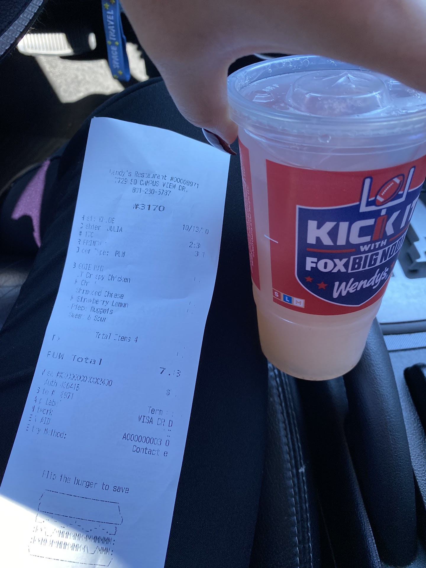 Then we get to the food. The quality was bad. Wendy's slogan is "quality is our recipe," but this location must have thought that means "poor quality is our recipe". The drink was watered down, i assume to cut costs (but that's like, a penny an order? Maybe?), they skimped on the condiments on my burger, and the nuggets were overcooked and dry, except one somehow. The fries were kinda lukewarm, but I'd been waiting a while, so they probably just cooled down.