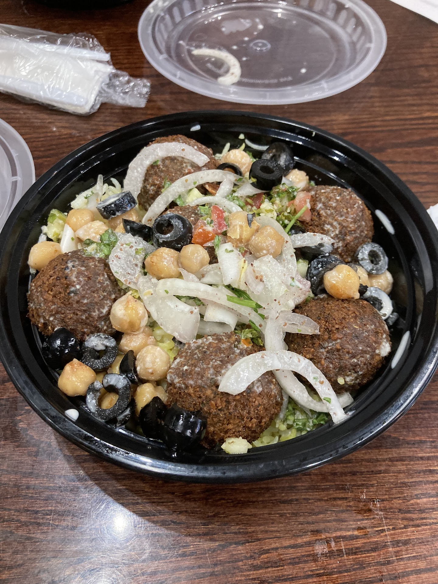 For those wondering how the bowl was put together, they put the base (basmati rice, in my case) on the bottom, the protein (beef shawarma) distributed on top of the rice, the onions, sliced tomatoes, and crunchy onions stacked in the middle, and the salads and tabbouleh were dolloped around the edge of bowl so the flavors don't get mixed up-- a concern of mine as I wanted to be able determine which flavors I liked best. The crunchy onions were added last to keep them crunchy on top. Tahini sauce on top of everything. I don't know how they fix the sliced tomatoes but they were warm and flavorful! I might get some sauce on the...