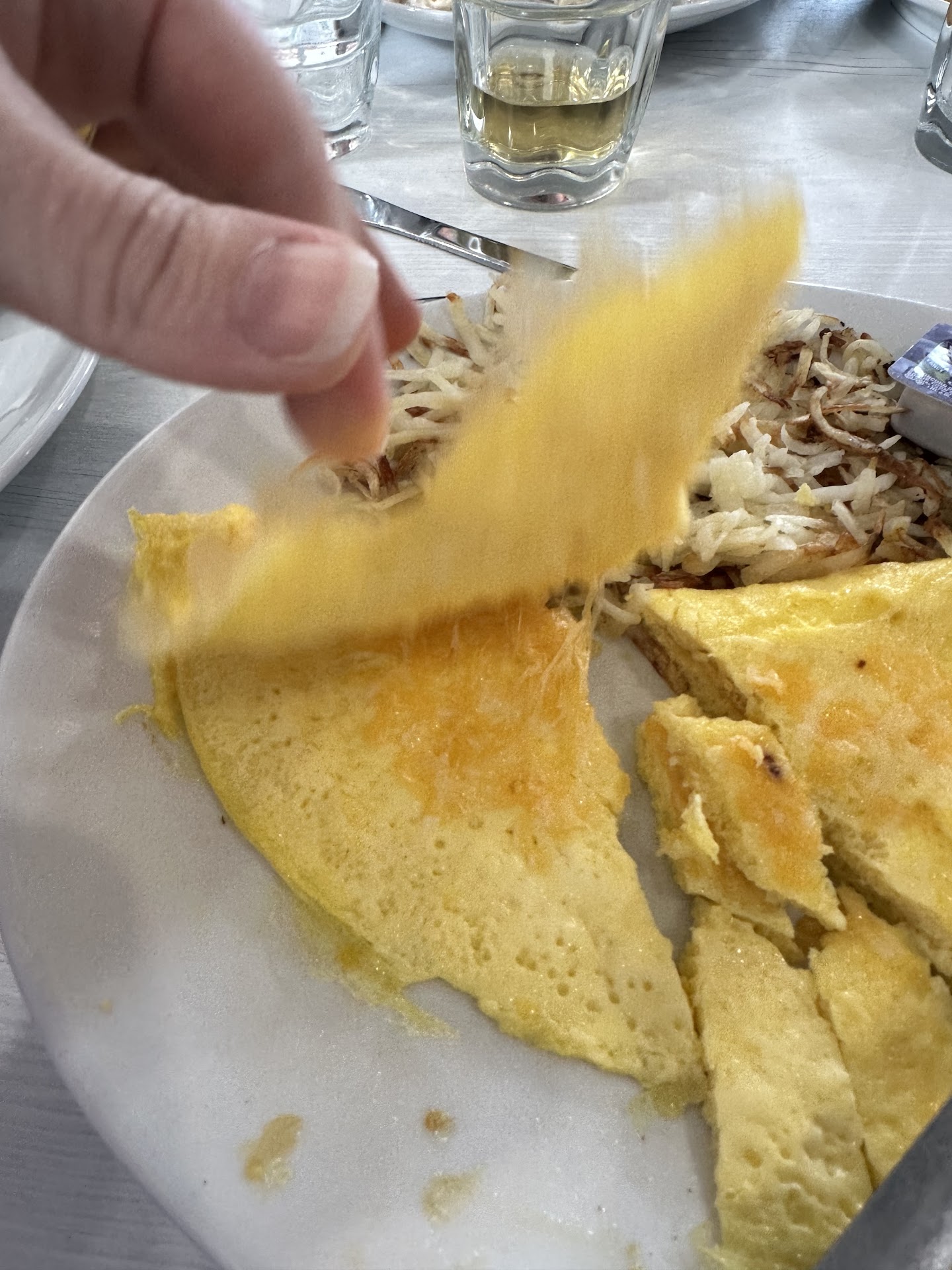 The servers stood around a lot just staring at the plates the kitchen was putting out, waiting for theirs. Instead, the servers could have been running food for each other or checking on their tables during this time. There was just so much standing around. And when the servers weren’t standing around, they all seemed too concerned with rolling silverware and prepping the fresh fruit to check on their tables. Our server rolled silverware most the time instead of checking on us. I understand rolling silverware is part of the gig, but this should never take priority over your tables. Also the young woman cutting fresh fruit was not wearing gloves and then would go pour coffee, run food, touch other surfaces, etc., then return to cutting fruit without gloves. Come on, this is basic stuff.