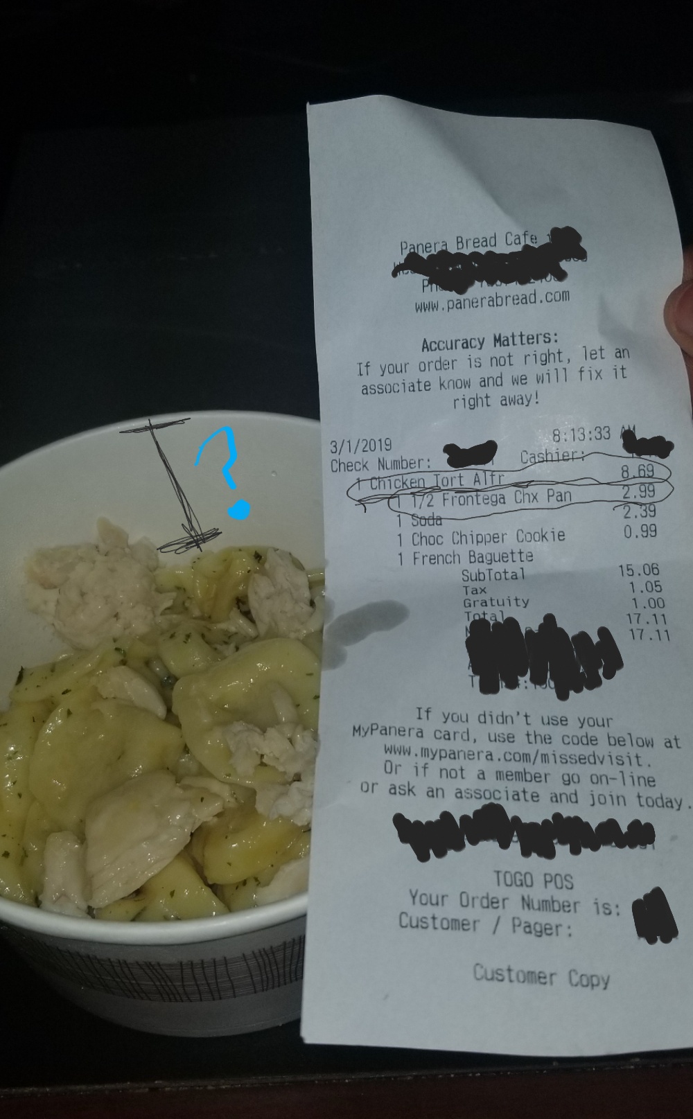 The restaurant was clean. There's your one star. However, I paid for a full pasta, a half sandwich, a drink and was even upsold a cookie at checkout. I even left a tip for you guys even though Linda didn't want to take the time to patiently address the register crashing when I mistakenly tried to enter a phone number when there wasn't a payment screen at POS. Lets talk about Linda for a second here. When I asked Linda if I could sample a tea before buying one (first time Panera customer, didn't know that the station in the back had sampler cups) she said that there was a line building and basically sold me the drink as though it were my fault there was only one cashier. In fact, another employee tried to use the other register to help customers, but before she could even offer, Linda told her to stay as a runner....for orders coming from one register. Now I try not to judge places based on the employees, after all it is 2019. So lemme tell you about my order. I paid near 9 dollars for a full Chicken Tortellini Alfredo pasta order. My bowl came half full. There is no broth in here, so I'm assuming they just keep the pasta in a broth until they serve it, which means they'd have to realize that they didn't fill the bowl all the way with my brothless pasta.