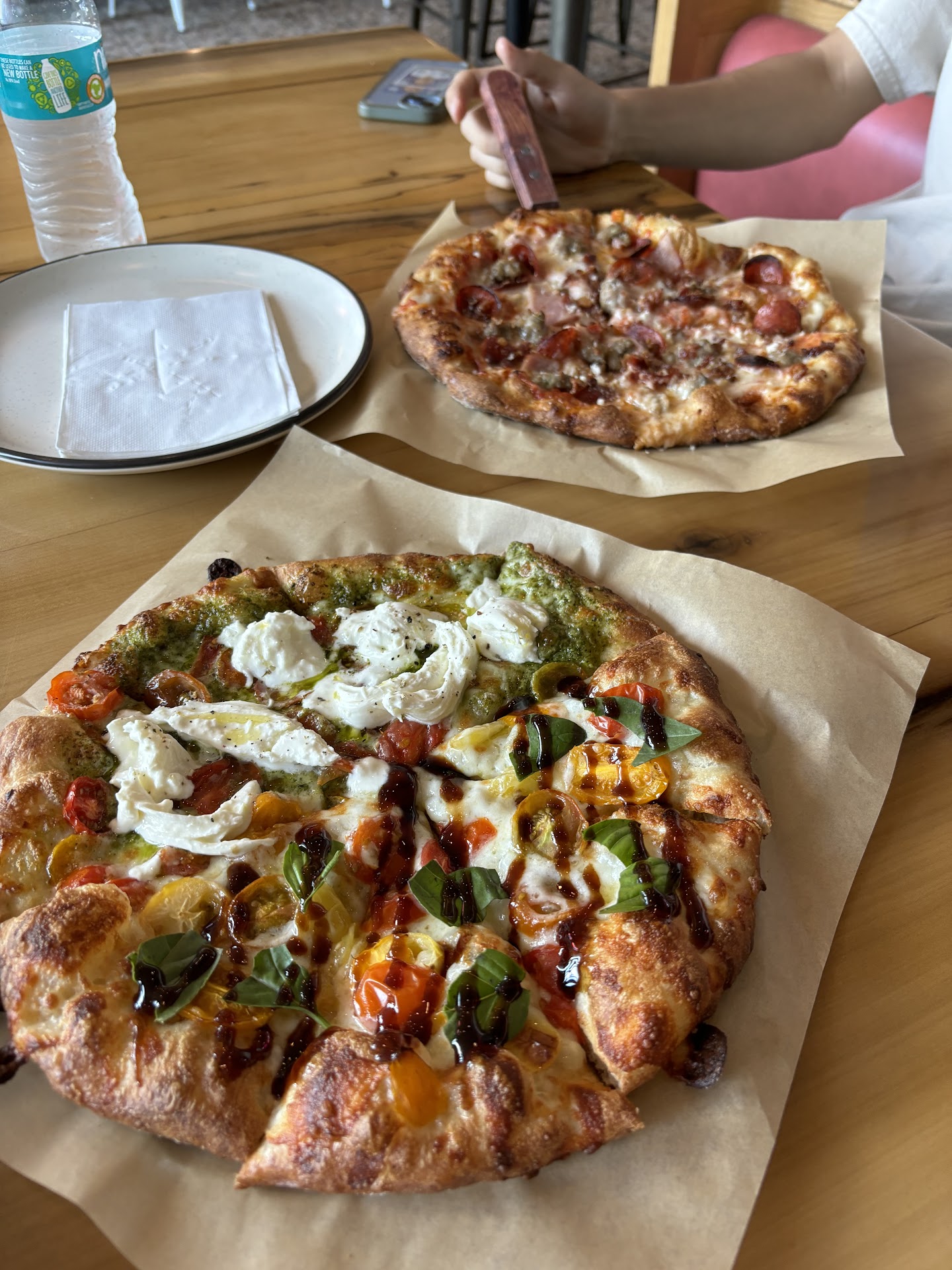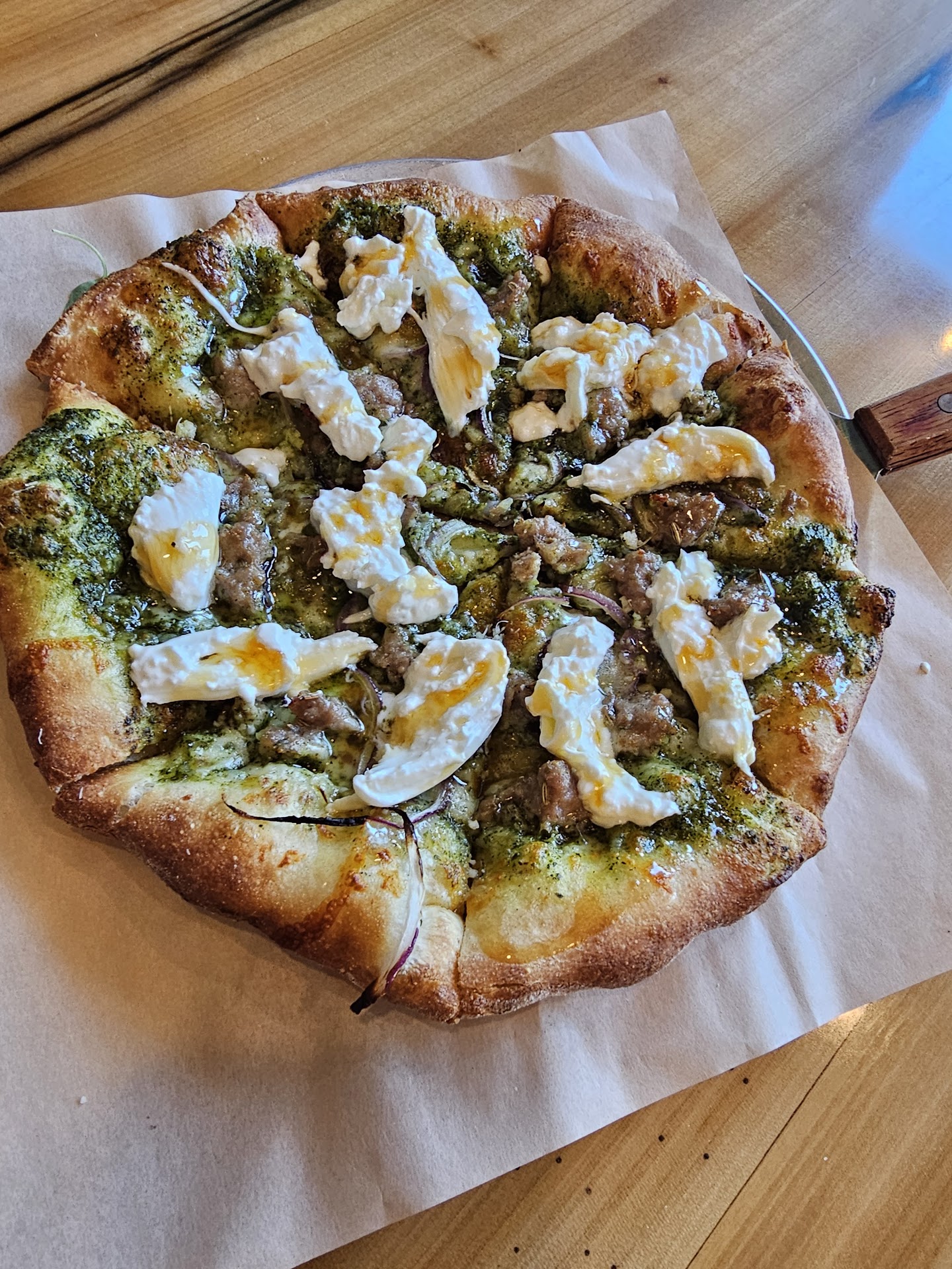 My wife got a 10" sausage and pesto. Salty, sweet, bold, aromatic, all tossed together to make a unique and delicious pizza. Things I never thought should be mixed together have now challenged them elevated my pallet.