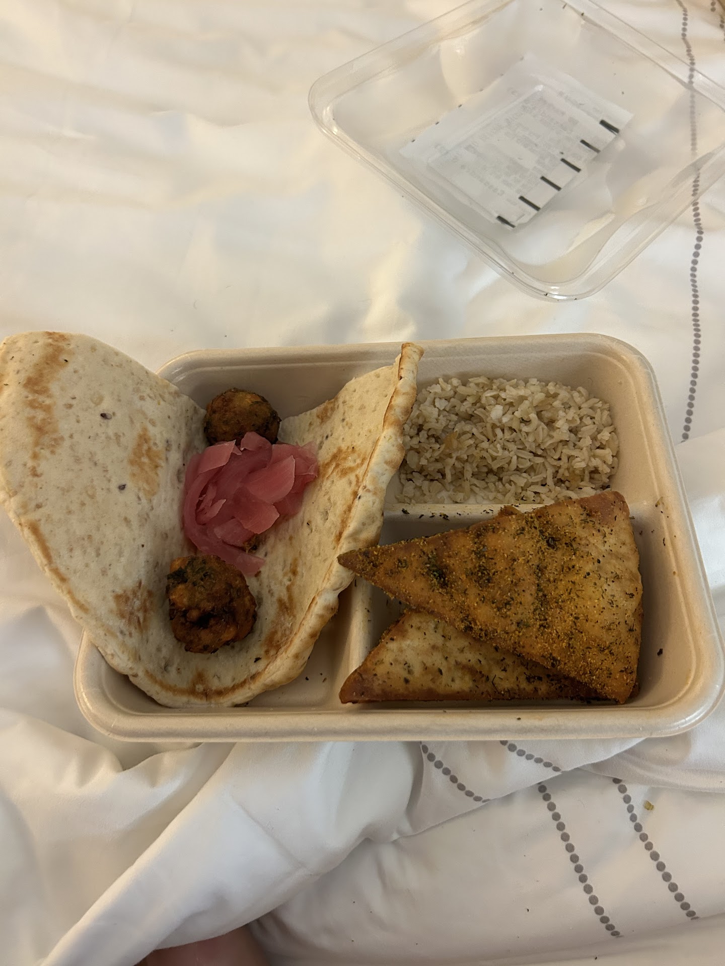 My favorite part being the creamy green skhug sauce with garlic sauce.