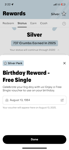 Ā Ā Ā Read moreI have frequently stopped in this location on my trips through York. I am also part of the crumble cookie club for building points and as of today, held a āsilver statusā. I stopped in today, 8/13, as I knew crumble cookie rewards its members with a free cookie on their birthday. Upon entering the store, I opened my app and they asked to scan the code. My code was unfortunately not there, but I offered to show her my license as proof of my birthday. The employee said showing my license would not work, and then encouraged me to use a reward I already had for a free cookie. Confused at the situation, and with another customer waiting behind me, I said āok, but I still donāt understand why showing legal documentation for my account was not acceptable verificationā. Trying to navigate my app I did discover that I also had $10 in crumble cash, so I opted to use that instead of the free reward for 1 cookie and instead left with 2 and paid the .97 left from an up charge.