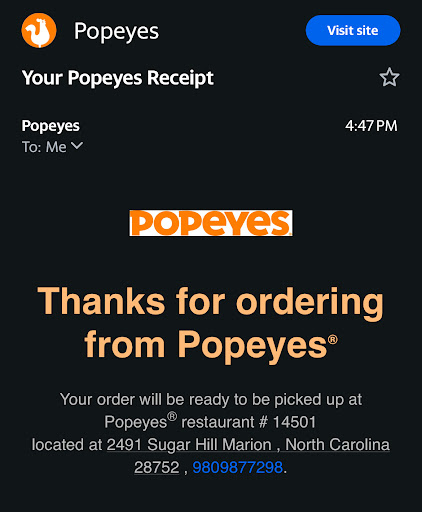 Stopped at this Popeyes on the way back home from a camping trip in TN. We were starving and really wanted Popeyes so we were stoked when we saw this along the route and could quickly use the restroom and order some food.