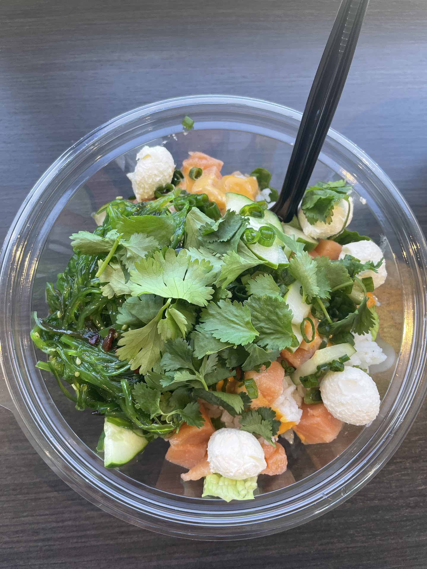 The food was incredible. I got a BYO bowl with rice and salad base, salmon, sesame and boom boom sauce (do NOT skip out on the boom boom sauce if you like a little heat), cilantro, cream cheese, cucumbers, green onion and seaweed salad. I was so impressed that the seaweed salad was made with GF soy sauce and the staff was quick to answer about it instead of having to go to the back and see.