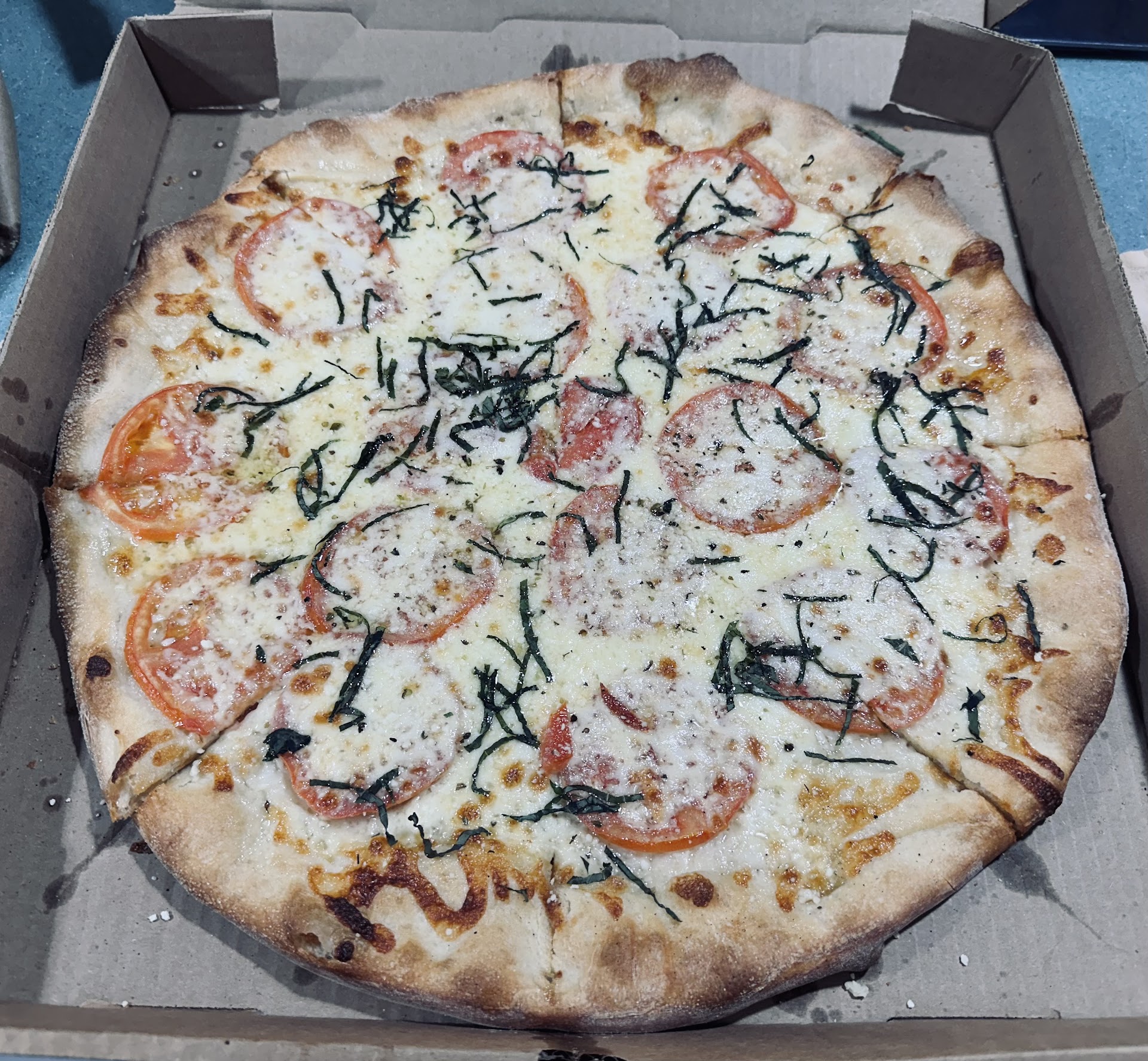 Rushing home as the succulent smells assaulted my olfactory nerve, my taste buds were at full attention when I pulled into BBDO HQ. I grabbed a piece of pie in my mitts and took a considerable bite. Holy Joltin' Joe! That's-a some pizza pie! It was so flavorful, so fresh, it gave me an instant Bronx accent. As with all things bread-based, if the bread blows, so goes the dish. This dough was flavorful, not too thin or thick and cooked to perfection. The ingredients were fresh and succulent. I am sure they do not have a garden in the back, but the tomato and basil tasted so fresh you could never convince my palate of that. Before the clowns start blabbering about how this isn't “New York” pizza, I want to say Thank The Bowery Boys because New York “style” pizza is atrocious. I also don't want to bend an ear to “the dough is under/over cooked or too thick/thin for authentic NY pizza. Yada, yada, yada, I've heard it all before.