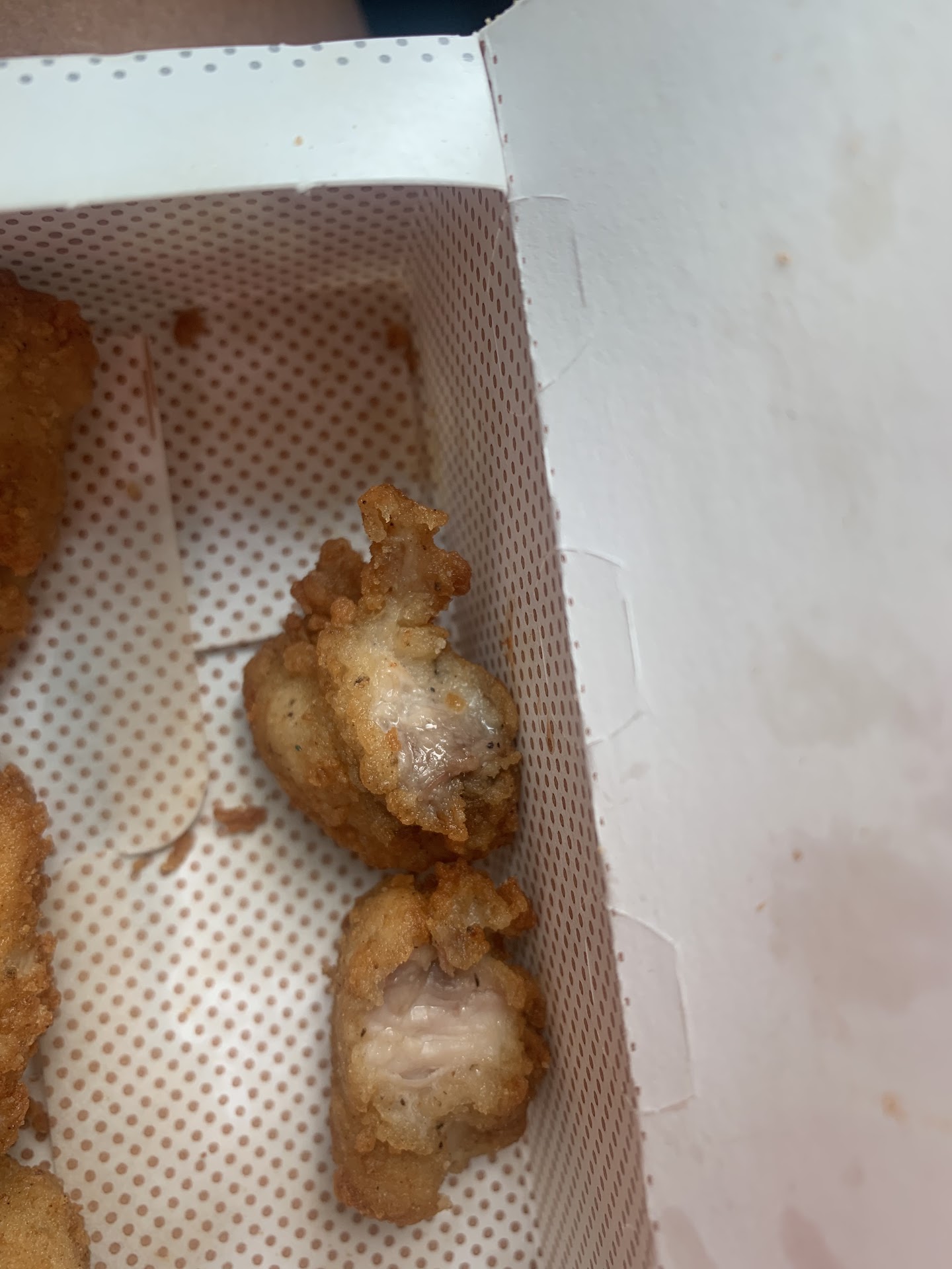 I went to CFA at this location the last night. I specifically asked for my order to be fresh because that’s my preference. The order was just an 8 count nugget and a 5 piece kids meal. I was asked the name for the order and was asked to pull forward to the line. When my food was brought to me, I asked for reassurance if the food was fresh and I was told yes. Cool. I left after I received my food and started eating on the way home. Food was indeed not fresh like I asked. I called and spoke to the manager on duty (Faith) and she was the sweetest about the situation. Told me she would put my name down and that I could come back to have it remade when I had the time. TODAY, I went to get it remade for lunch. I went on the inside this time around. One of the many managers on duty (which was a male) looked my name up to replace the order. Not a problem, although I did add on a few items. I used my rewards to add a fry and I purchased a drink. Nothing to major. We waited for a short while and then we received our food. I carried the food out and left. I do look at my food while eating, and I had already eaten 4 nuggets when I realized that this is what the chicken nugget looked like. DISGUSTING! I turned around to take it back as I’m positive that this is not what is supposed to be served to a customer. Especially when this is supposed to be a remake for a previous order. I opted to go through the DT when I went back since they tend to give faster service through there. I showed one of the employees in the DT and he was alarmed at what I showed him and he showed compassion about the matter. He used the walkie talkie to let one of the managers know that I’d be coming to the window. Considering the picture I’ve posted and that this was my THIRD time driving up there, I did not want another remake. I wanted a refund. Not once was I rude to anyone because I treat people how I’d like to be treated. But I did not feel as though upper management cared. I went on to show them the reason why I wanted a refund. The employee at the window acted as if he didn’t see an issue with the way the nugget looked and neither did the manager at the window. The manager was a woman this time around and it felt like she was just trying to rush me out of the line when I was trying to show her what the nugget looked like. I did get a refund for the nuggets but at the end of the day, this is unacceptable. I am not a happy customer. I called CFA cares as well but I couldn’t submit a picture to show you all so that’s why I’m...