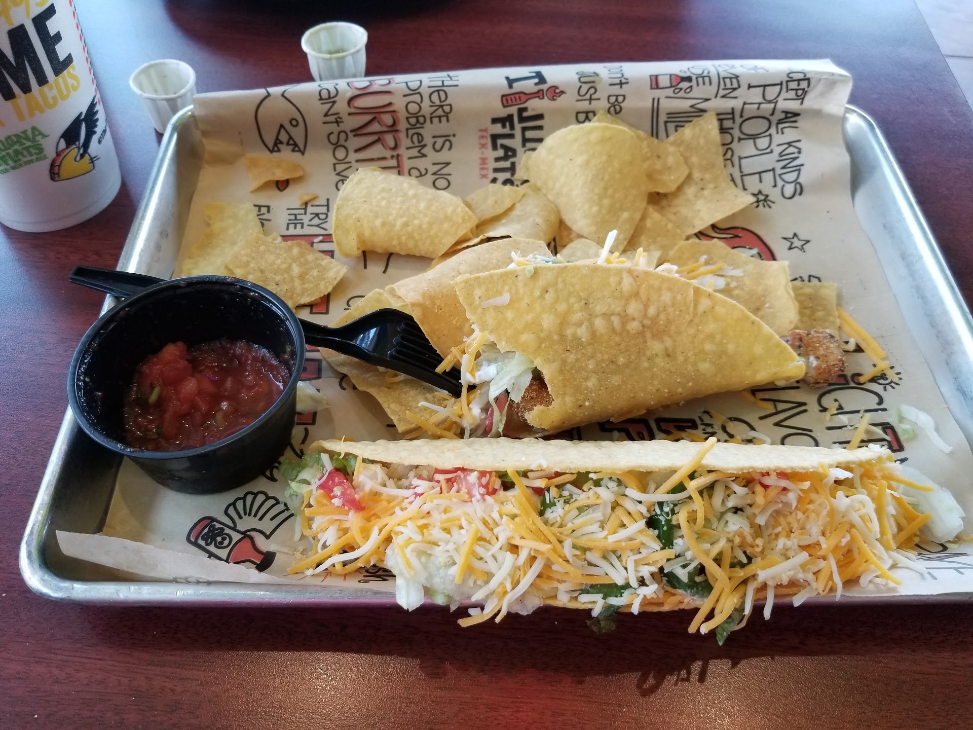 Read moreFirst time at the Flats. I was a bit leery in eating at Tijuana Flats because I lived in San Diego and right across the border was Tijuana. My wife and I went occasionally for dinner or drinks. The food has always been exceptional, especially if you eat on the street. Now you can understand my cautiousness. I have to admit that the server who took our order was very polite and took her time to get our orders correct, I thought we took long but she was very patient. We ordered a few different items chicken, shrimp, taco salad, all tasted very well and the salad was fresh and crispy. The chips were fresh. I believe that the oil was right at the tip of changing so the chips wasn’t bad, but it just started tasting a little bit oil compromised. We also ordered some churros with the chocolate sauce. This was my big disappointment the chocolate sauce I don’t think had chocolate. I think it was just some chocolate flavored sauce. In other words it was not good. Overall, the food was good and I will definitely go...