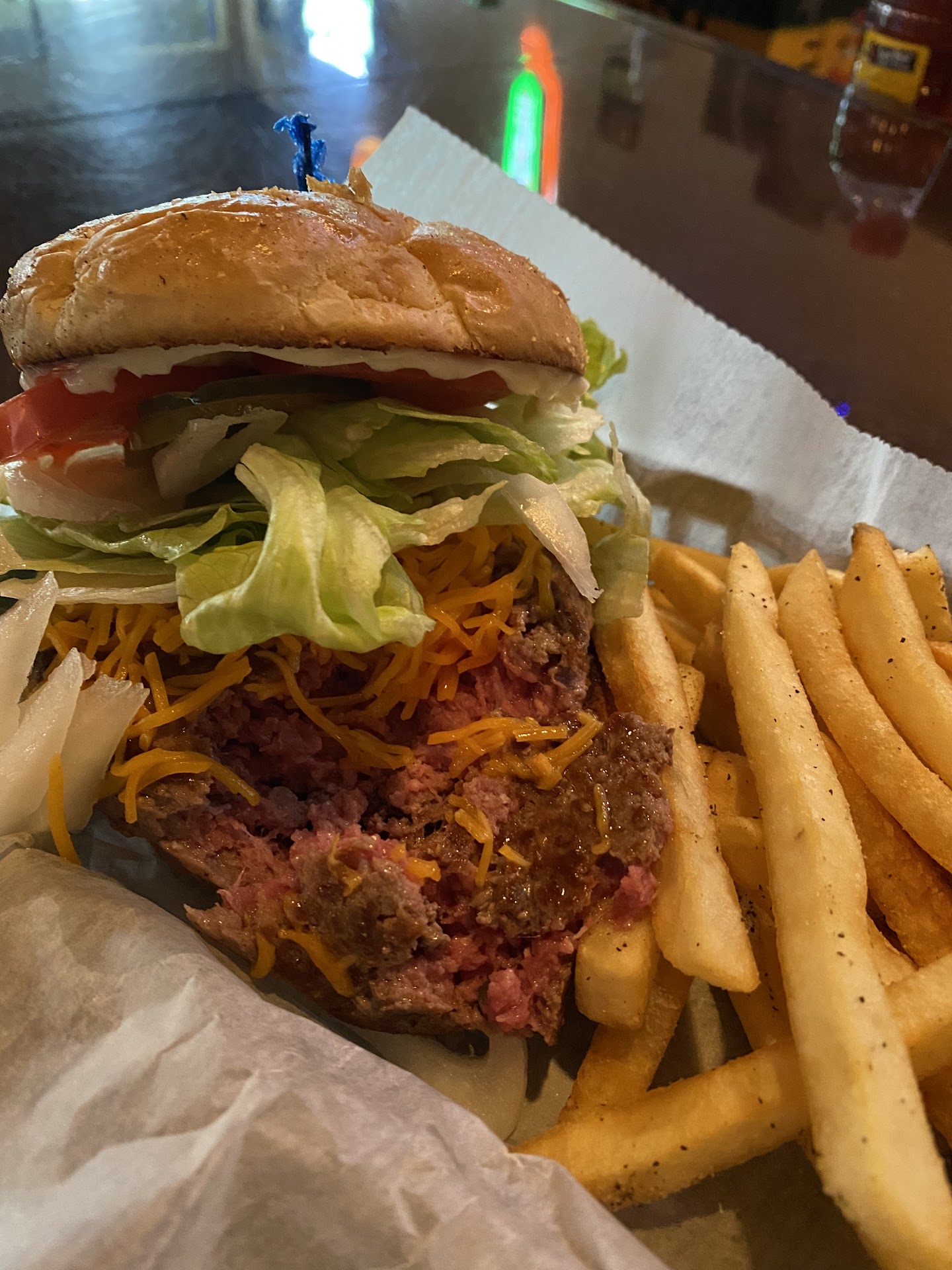 As Mandy turned to get to work on my grub, I took a moment to take in the joint. I love coming to bars early, you can smell the stale alcohol and fun from the night before. Mandy returned with my Scotch and I must say, it looked like a good 3 oz pour...very generous. As I am 163 days sober, I won't be tasting it, but what a bang for your buck. The place is loaded with fun games and had a classic inviting bar atmosphere (think local watering hole).