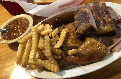 I ordered the 'A Taste of Woody's' combo, for $16.99. That's a platter of spare ribs, BBQ pork, Texas beef brisket, smoked turkey breast, smoked sausage and BBQ chicken, with fries and BBQ beans as sides. A WHOLE lotta food, folks! But, I figured this way I can sample everything worth samplin! I was NOT disappointed! I really enjoyed the smokey good flavors on the variety of textures and tastes. Darn fine BBQ at a decent price!