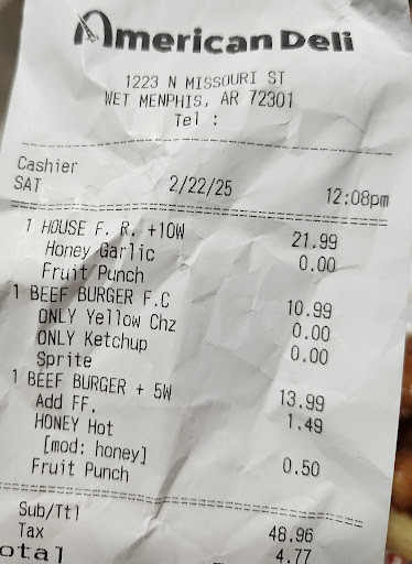 I finally decided to try American Deli here in West Memphis. I think I should have kept going because I'm not sure what I was expecting. I ordered #6 burger, fries, 5pc wings, and a fruit punch drink. Burger had everything on it good bun to meat ratio, but it was very bland couldn't taste the mayo. The patty was not seasoned, not good. Fries were half seasoned and cold, not good. The wing flavor was honey hot, I could not taste the honey nor the hot, and by the time I received the drink, it was a watered down kool aid. For 3 meals, $50 is not bad not good but the cost of inflation is something. I'm good and I will not...